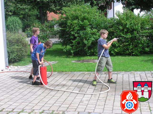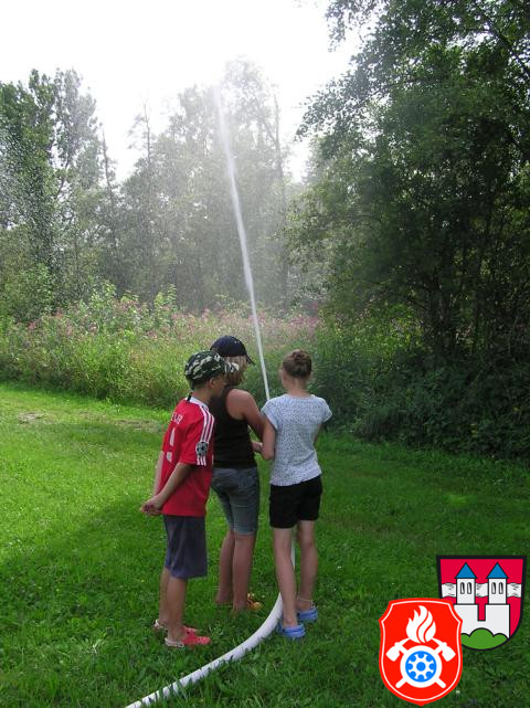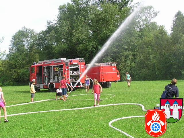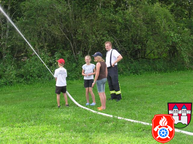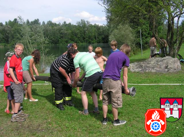 Trotz der vielen verregneten Vortage, erstrahlte auch dieses Jahr wieder herrlicher Sonnenschein bei warmen Temperaturen. 16 Kinder wollten einen Nachmittag lag Feuerwehrmann/-frau sein. Das Ferienprogramm begann mit einer Führung durchs Feuerwehrhaus und Besichtigung der Einsatzfahrzeuge und deren Ausrüstung. Im Anschluss wurden verschiedene Spiele gemacht, wie zum Beispiel Schlauch ausrollen, Leinenzielwurf und spritzen mit der Kübelspritze, sowie auch das durchqueren der Kriechstrecke, machte den Kindern großen Spaß. Nach den Spielen fuhren wir zum Rotter Ausee und machten einen Löschaufbau, wo natürlich alle Kinder selbst spritzen durften. Der Wasserspaß gefiel den Kindern sehr gut, außerdem war es eine wohltuende Abfrischung. Zum Abschluss des Tages gab es im Feuerwehrhaus noch eine Brotzeit und jedes Kind bekam eine Urkunde.