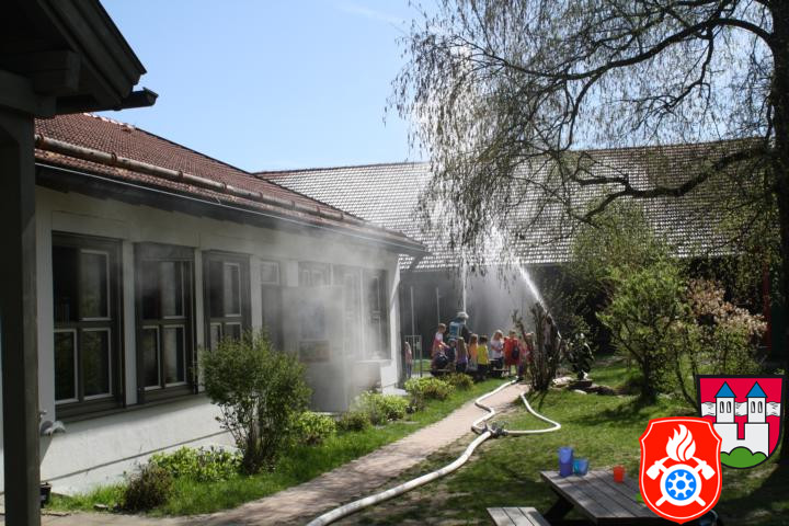 Am Ende war eine erfolgreiche Übung das Ergebnis des großen Ereignisses. Wer Lust hatte durfte die Feuerwehrmänner noch beim Spritzen untestützen oder einen Blick in das verrauchte Zimmer werfen. Die Mädchen und Jungen bedankten sich mit einem Feuerwehrlied bei der Feuerwehr. Außerdem wurde eine Brotzeit für die Einsatzkräfte spendiert.