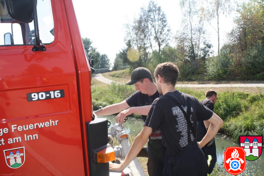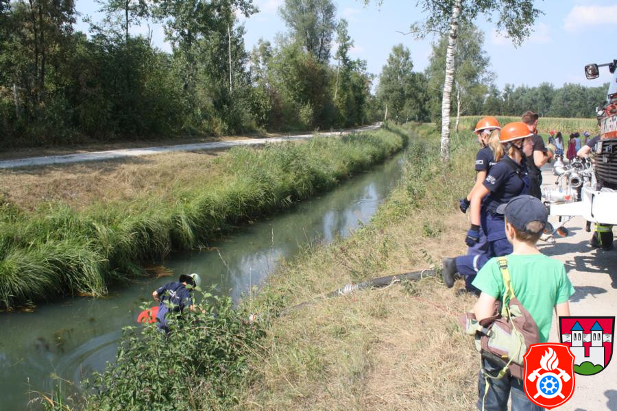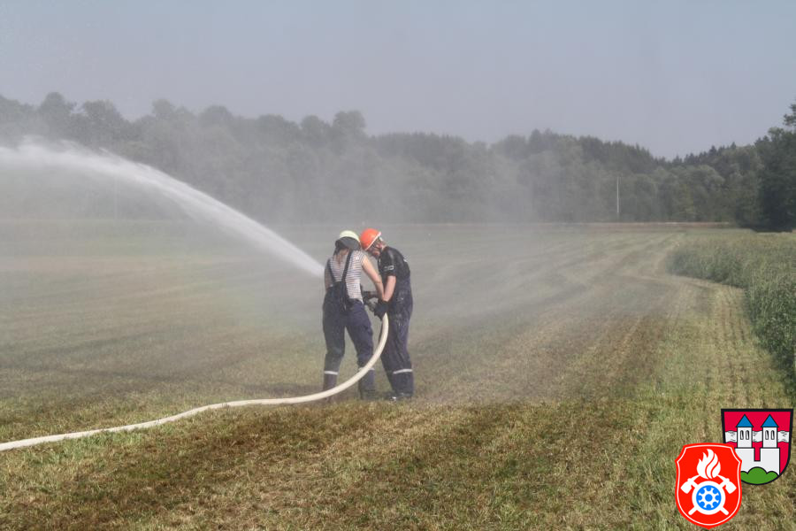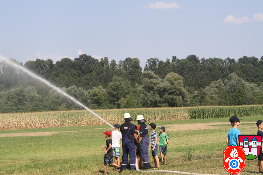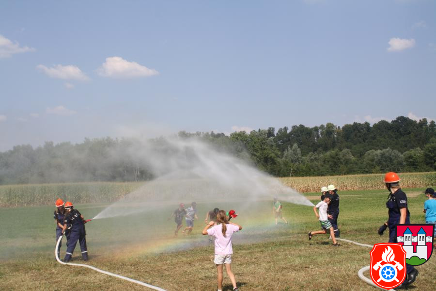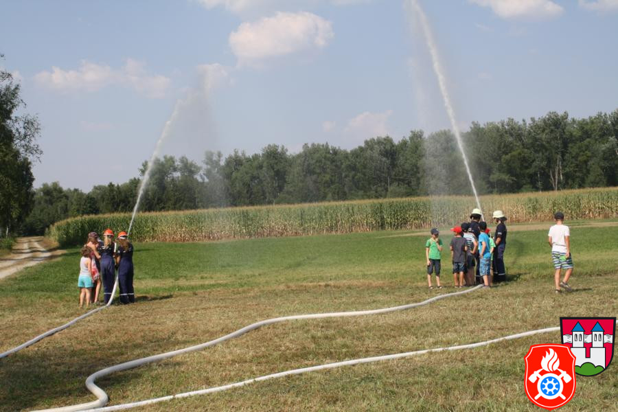 Nachdem alles genauestens unter die Lupe genommen wurde haben wir alle Fahrzeuge besetzt und sind Richtung Innstufe gefahren, wo wir kurz vorher in einen Feldweg eingebogen sind. Dort haben wir mit unserer Frontpumpte und den dazugehörigen Saugschläuchen des 44/1 das Wasser aus dem Bach „Rott“ gepumpt und es anschließend über einen Verteiler auf zwei C-Strahlrohre und ein B-Strahlrohr geleitet. Die Kinder und die Mitglieder der Rotter Jugendfeuerwehr hatten viel Spaß bei dieser Aktion und der ein oder andere kam auch nicht trocken davon. Nachdem wir alles wieder zusammengeräumt hatten und wieder nach Hause gefahren sind, gab es bei uns am Feuerwehrhaus noch eine kleine Stärkung, wobei man den ganzen Nachmittag noch einmal Revue passieren lassen konnte. Mit der zum Schluss erhaltenen Urkunde wurden alle Teilnehmer/-innen verabschiedet.