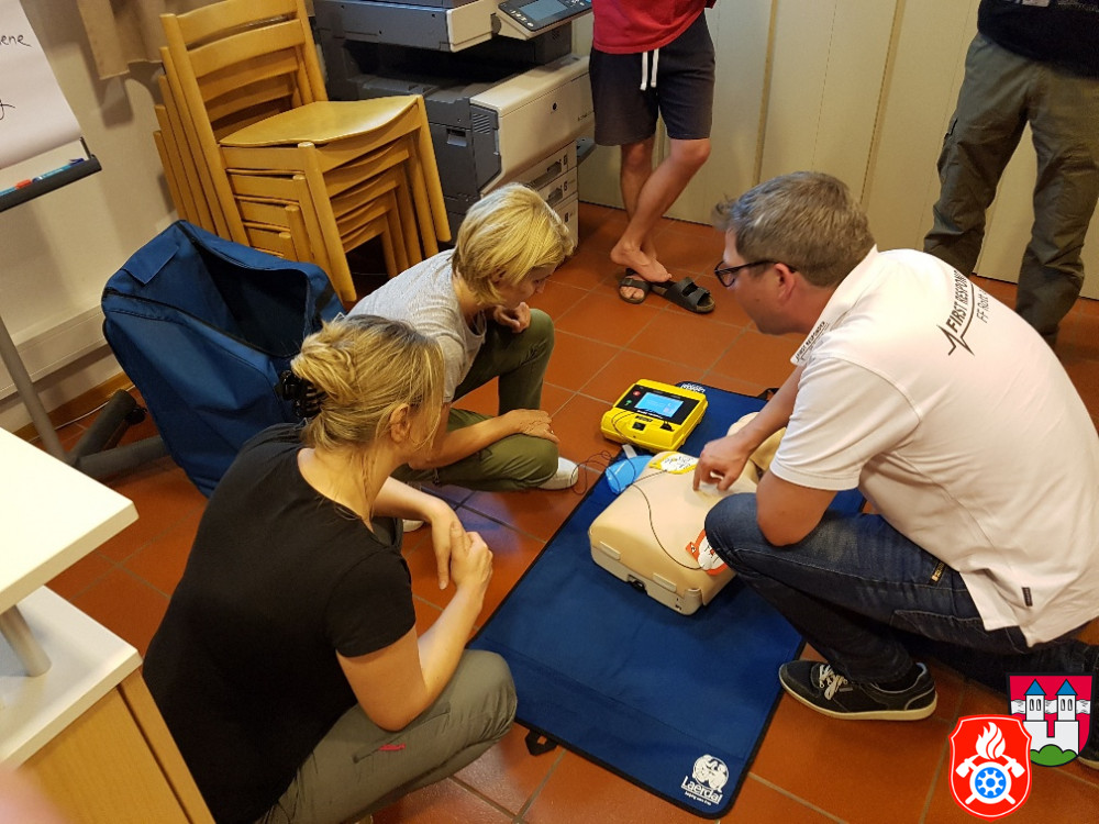 Die Teilnehmer hatten auch die Möglichkeit verschiedene Erste Hilfe Maßnahmen zu üben, wie z. B. die Wiederbelebung oder das Durchführen einer stabilen Seitenlage. Zudem standen unsere First Responder auch für eine Fragen und Antworten Runde zur Verfügung, um offene Fragen zu beantworten.