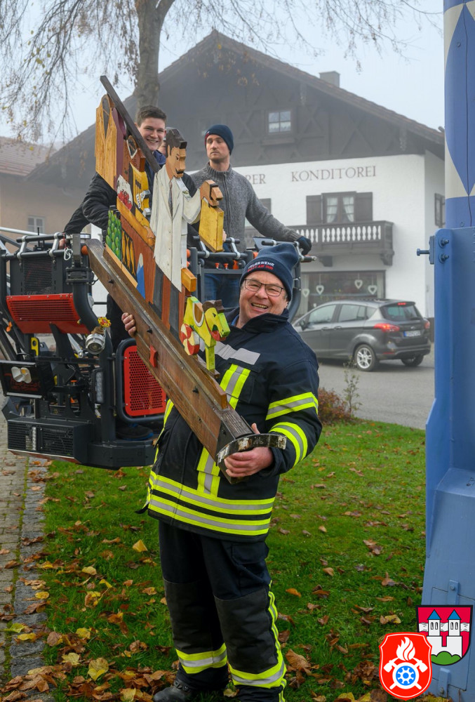 Nun haben wir zusammen mit dem Burschenverein mit unserer Drehleiter die Schilder demontiert und sicher eingelagert. Demnächst wird mit einem Arbeitsgerät der Baum abgetragen. Ein Jahr muss sich die Bevölkerung gedulden, der nächste Baum ist für den 1. Mai 2024 geplant. Dieser wird bestimmt genau so schön wie seine Vorgänger.