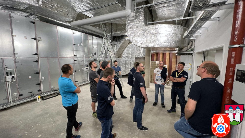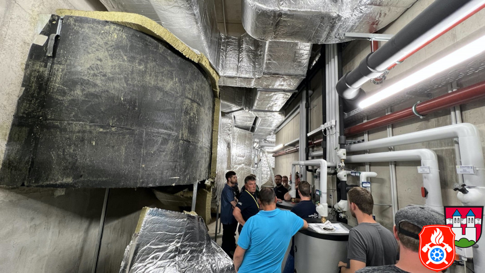 Über den Kinderhort ging es anschließend über die Treppenhäuser durch die Stockwerke und Klassenzimmer. Fluchtwege und Rauchabzüge wurden besichtigt und eingeprägt. Über die Nordseite bewegten wir uns in das Kellergeschoss, wo wir in den Facharbeitsräumen z. B. die Positionen der Gefahrgutschränke kennen gelernt haben. Angekommen im Technikkomplex machten wir uns einen Überblick über sämtliche Medien wie die elektrische Energiezufuhr, die Heizungs- und Lüftungsanlage, den Pelletsbunker, die Fettabscheider, den Fahrstuhl, etc.