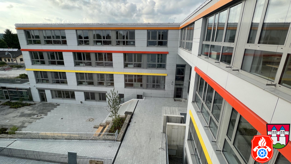 Zusammen mit Peter Perfler vom Bauamt Rott am Inn und Kommandant Manfred Lunghammer trafen wir uns vor dem Gebäude zur Einleitung in die wichtigsten Daten und Zugänge. Dann starteten wir auch direkt los mit der Besichtigung. Im Erdgeschoss ging es über die Mensa gleich in die Aula, in welcher sich die für uns wichtige Bedienung der Brandmeldeanlage befindet. Die Steuerung ist genormt und auch in anderen Rotter Großgebäuden so zu finden. In dieser befinden sich auch vorbereitete Gebäude- sowie Melderpläne, welche uns im Einsatzfall sehr behilflich sind.