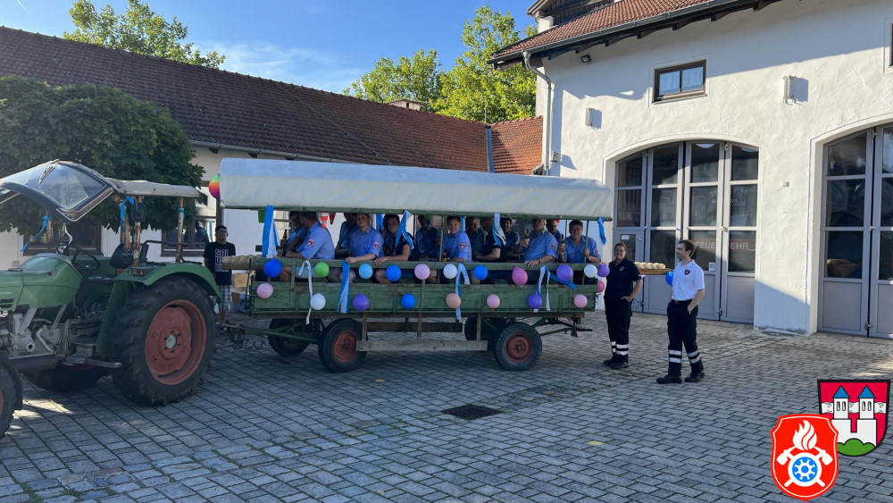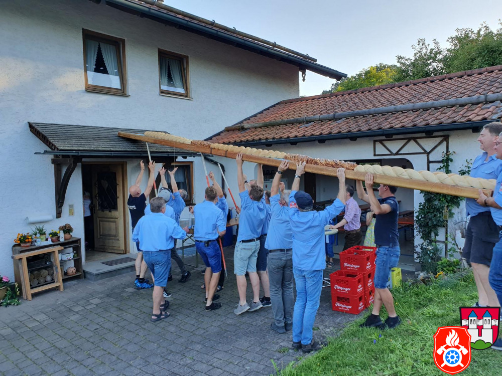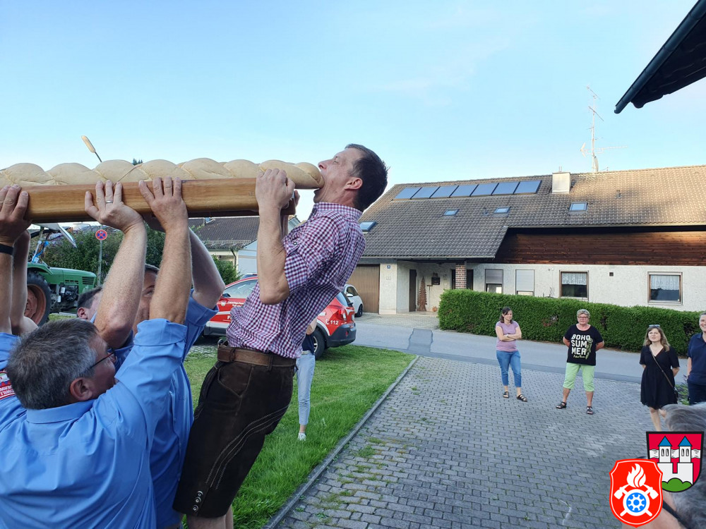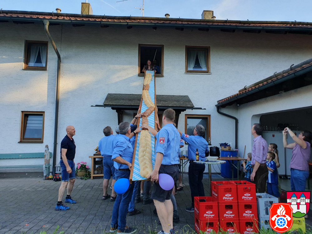 Dort angekommen wurde das Gebäckstück, liegend und befestigt auf einer Leiter, von unseren Aktiven per Hand hochgestemmt und versucht dieses irgendwie in das Haus zu befördern. Dies klappte aber (gewollt) nicht auf Anhieb. Mehrere Versuche und Messungen waren nötig, um schließlich das Brot samt Geschenken für die Kinder zu übergeben. Feierlich wurden wir anschließend auf eine kleine Brotzeit in der Garage eingeladen. Wir wünschen der jungen Familie alles Gute für die Zukunft und bedanken uns für die nette Bewirtung.
