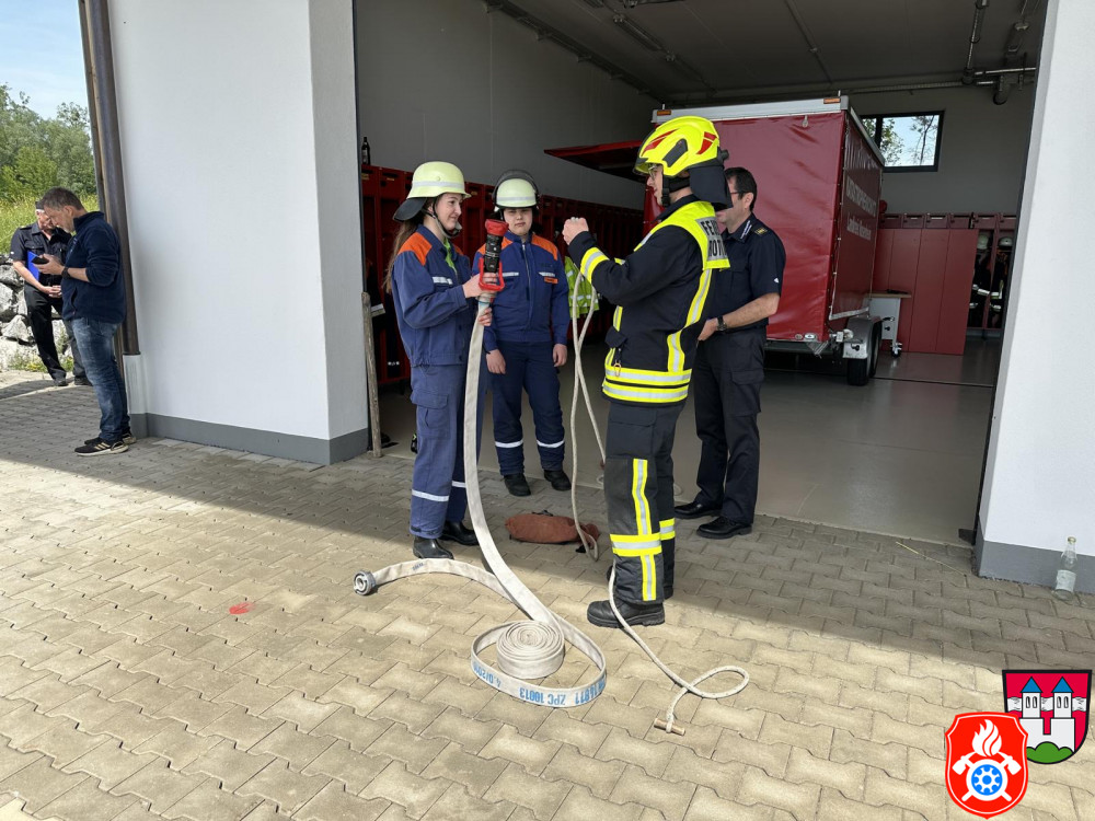 Bei der Abnahme wurde Verschiedenes zum Funkgerät, den Statusmeldungen der Feuerwehr sowie zu den Funksprüchen gefragt. Weitere Stationen wie Knotenkunde, In- und Außerbetriebnahme eines Hydranten, Aufbau einer Schlauchbrücke, Auffinden einer bewusstlosen Person sowie ein theoretischer Fragenteil rundeten die Prüfung ab.