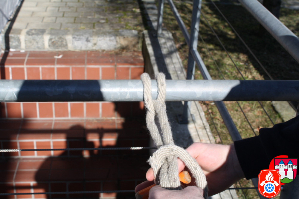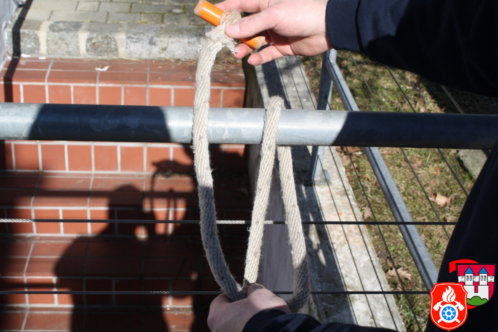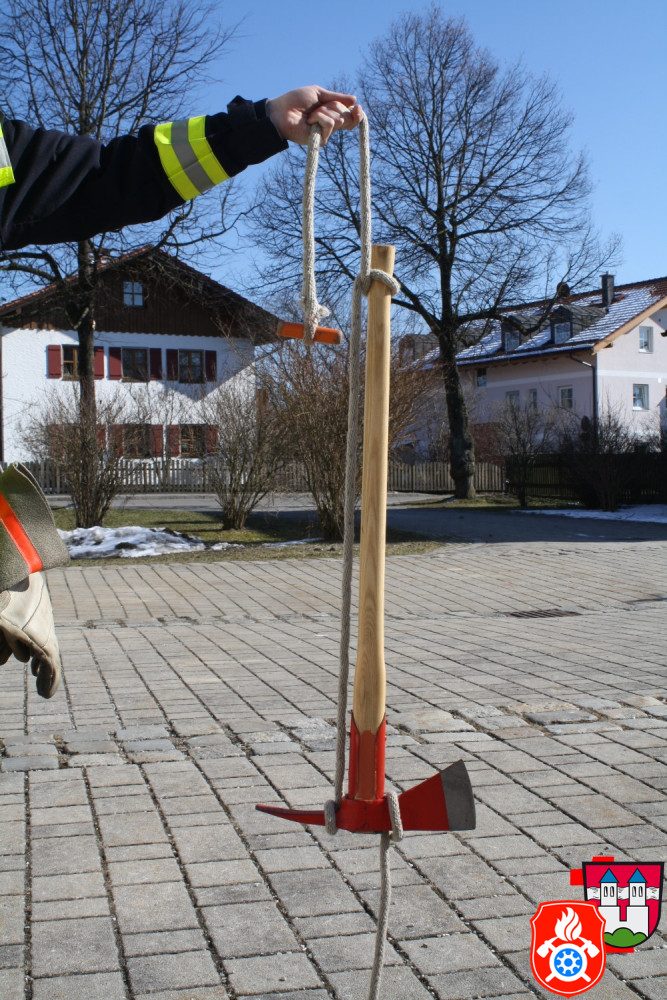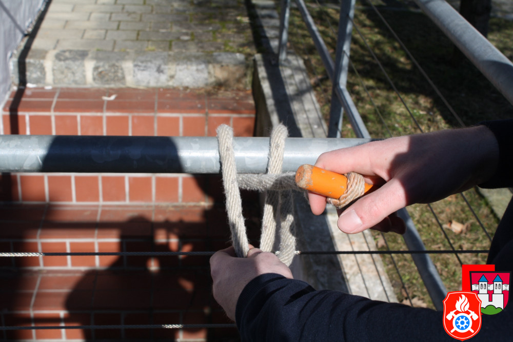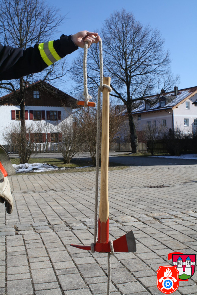 Der Mastwurf an Gegenständen wie z. B. der Feuerwehraxt wird verwendet, um diese sicher in Höhere Ebenen zu ziehen / befördern. Der Mastwurf sichert die Feuerwehraxt ab, damit diese nicht runterfallen kann. Zusätzlich wird am Griff ein Halbschlag angelegt. | |