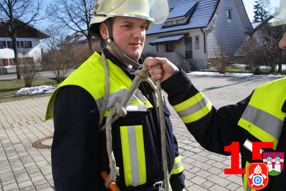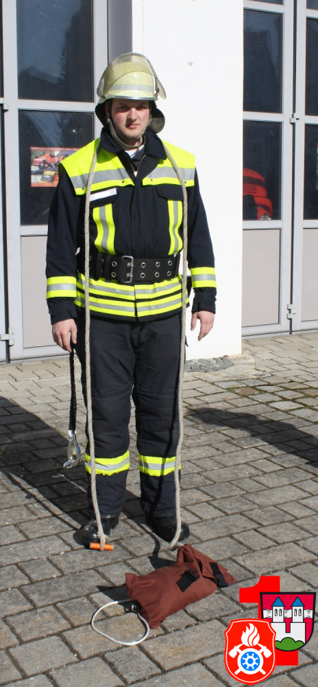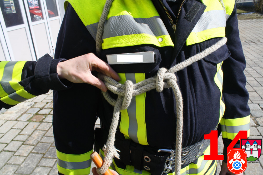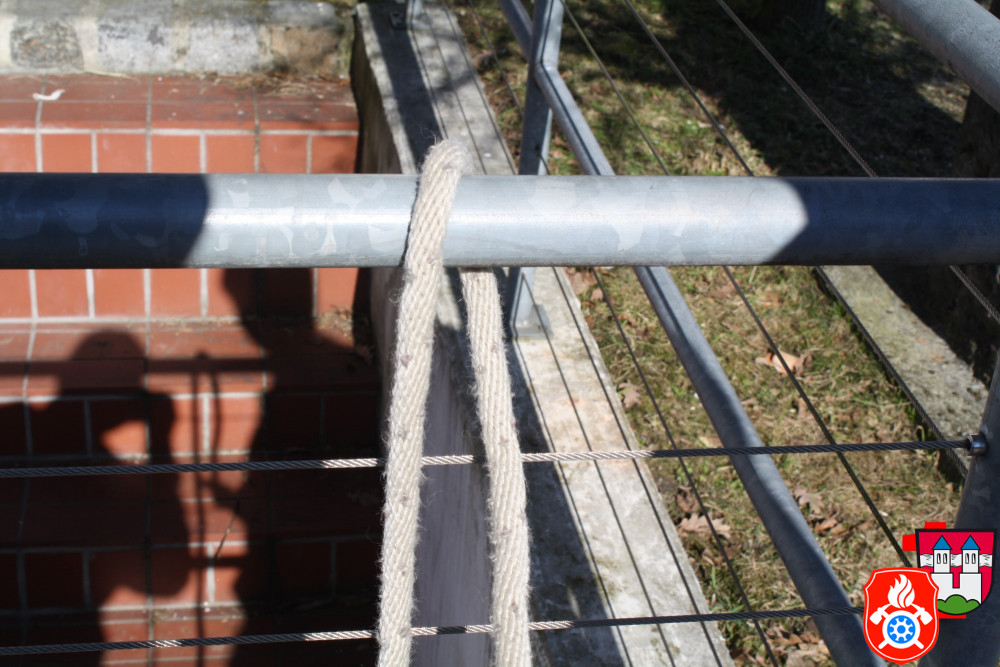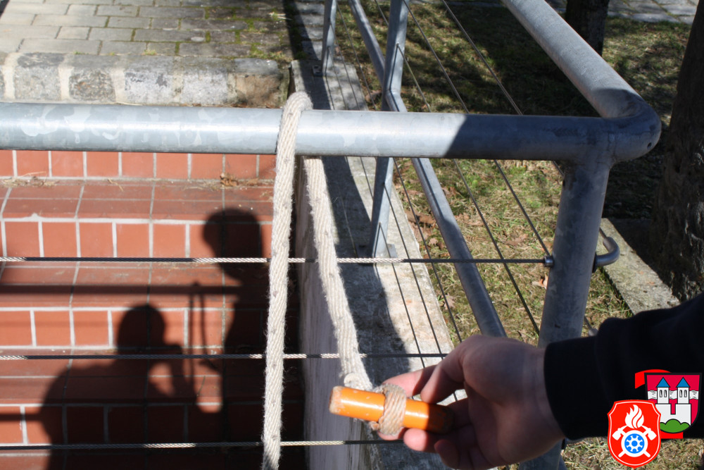 Der Mastwurf an Gegenständen wie z. B. der Feuerwehraxt wird verwendet, um diese sicher in Höhere Ebenen zu ziehen / befördern. Der Mastwurf sichert die Feuerwehraxt ab, damit diese nicht runterfallen kann. Zusätzlich wird am Griff ein Halbschlag angelegt. | |