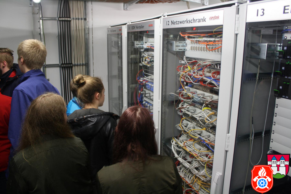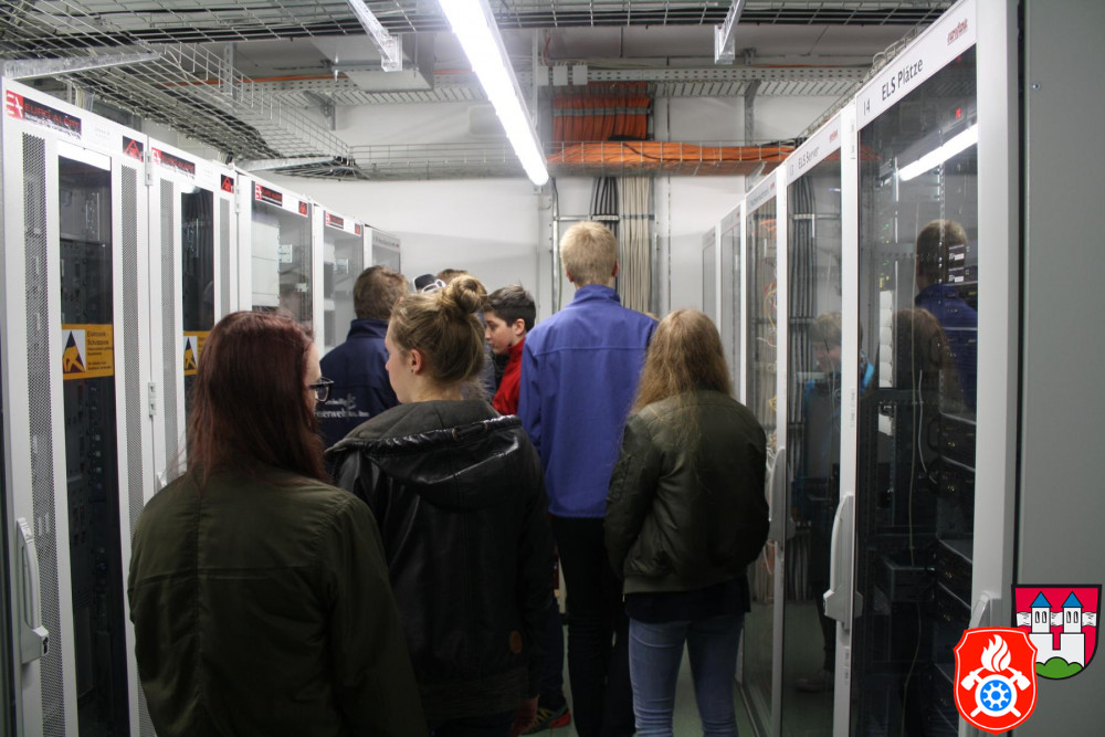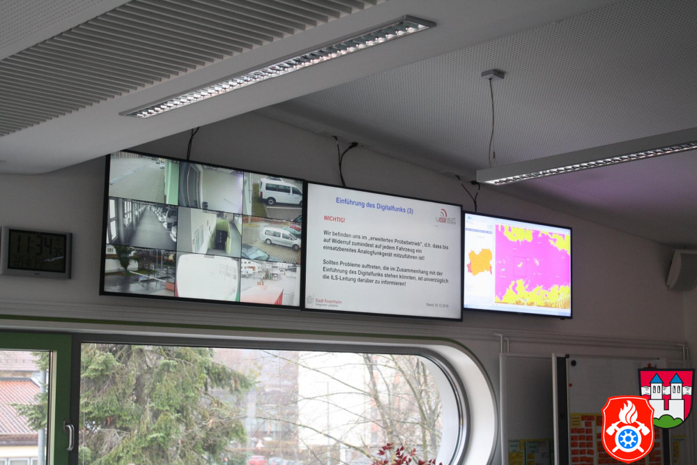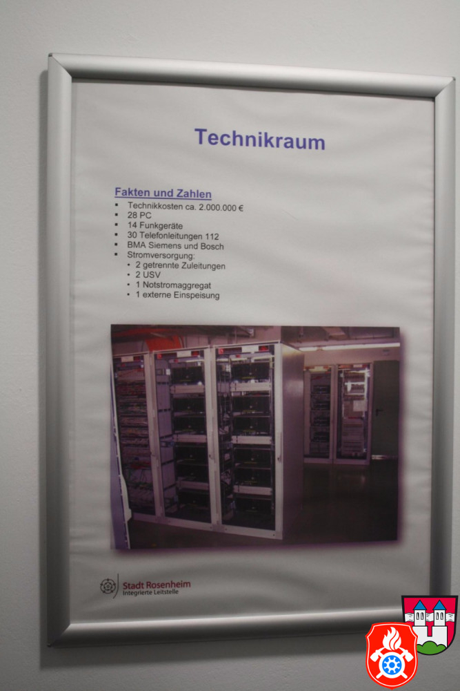 Frisch und munter sind wir bereits um kurz nach neun Uhr mit unseren Fahrzeugen Florian Rott 11/1 und 44/1 nach Rosenheim aufgebrochen. Dort wurden wir dann von dem Dienststellenleiter Thomas Vogl empfangen. Dieser machte mit uns eine Führung durch das moderne Gebäude, welches im Jahr 2007 auf dem Gelände der Freiwilligen Feuerwehr Rosenheim erbaut wurde. Begonnen haben wir die Führung im Erdgeschoss, in welchem sich die Verwaltung, der elektrische Betriebsraum und der Server-/Technikraum befindet. Die ILS Rosenheim verfügt als Sicherheit über zwei Stromzuleitungen und wäre selbst dann, wenn beide Leitungen ausfallen würden, mit einer USV (Ununterbrochenen Stromversorgung) bestehend aus 80 LKW-Batterien für viele Stunden gerüstet. Sollte selbst dies nicht reichen verfügt die angrenzende Freiwillige Feuerwehr Rosenheim noch über ein Diesel-Notstromaggregat, welches für über eine Woche ausreicht. Mit einem Stormverbrauch von 80 kVA ist dies nicht zu unterschätzen.
