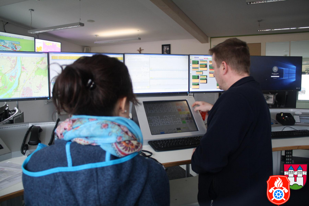 Im Obergeschoss wurde uns eine Präsentation über die Leitstelle Rosenheim, deren Aufgaben und die Einstiegsmöglichkeiten gezeigt. Im Raum nebenan war dann das Herzstück der Leitstelle. Der Raum, in dem sich die tagsüber bis zu sechs und nachts bis zu vier Disponenten in Zwölf-Stunden-Schichten rund um die Uhr befinden. Der Raum, in dem jeder Anrufer, der die 112 im Rosenheimer Landkreis wählt, rauskommt. Wir waren live dabei, wie die Disponenten Anrufe annahmen, mit den Feuerwehren funkten, Rettungsdieste alarmierten und um Punkt 12 Uhr den monatlichen Probealarm auslösten. Unsere Fragen wurden uns freundlich beantwortet.