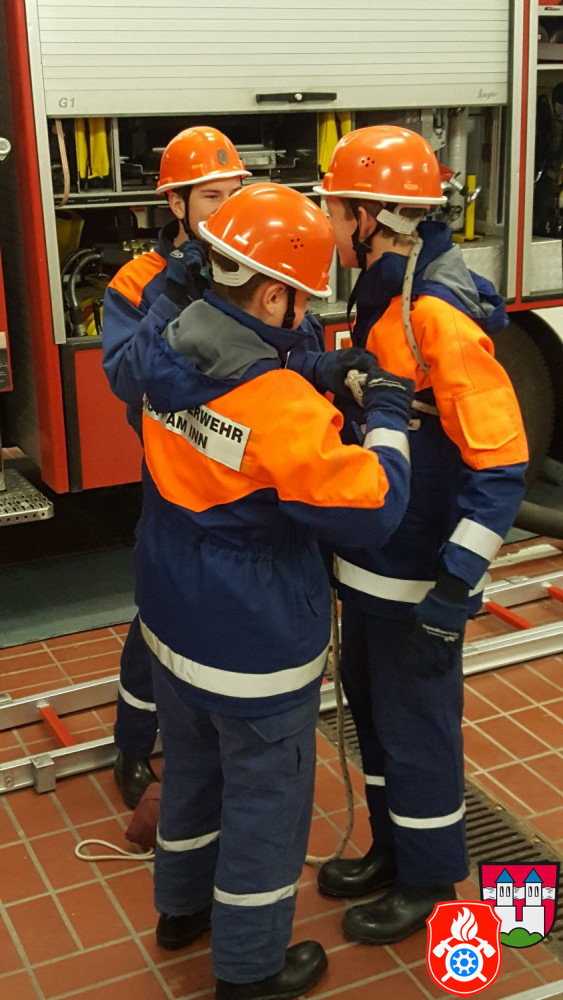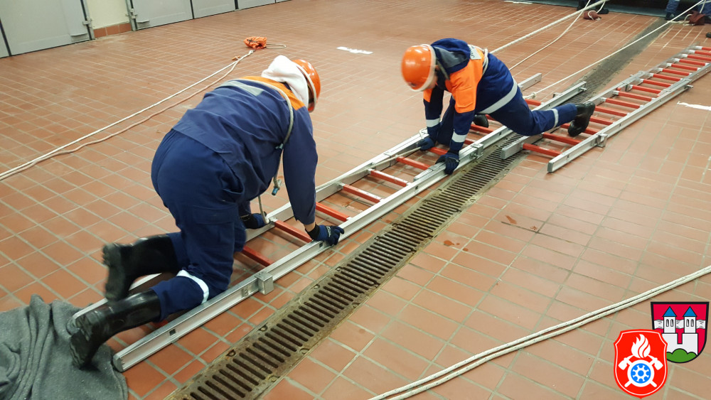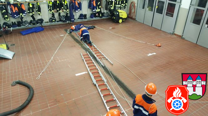 Hier haben wir auch die Möglichkeiten für eine Rettung als Privatperson besprochen. Zusätzlich lernten wir verschiedene Rettungstechniken und Hilfsmittel der Feuerwehr und anderen Hilfsorganisationen für diese speziellen Einsätze kennen. Eine der Rettungskarten, die der Feuerwehr zur Einsatzunterstützung zur Verfügung steht, lernten wir kennen und verwendeten diese im praktischen Teil der Übung. Mit zwei Leitern und vier Rettungsleinen retteten wir im trockenen einen Kameraden, welcher im Eis eingebrochen war. Geübt wurde dies in unserer Fahrzeughalle. Eine Woche später, am 23.01.2019, lernten wir wie man das Einbrechen im Eis verhindert und wie man am besten versuchen kann sich selbst aus dieser gefährlichen Situation zu befreien. Besonders Interessant waren auch die Reaktionen unseres Körpers auf Unterkühlung und die Maßnahmen, welche unser Körper eigenständig durchführt um sich selbst in dieser Situation zu schützen. (Dies haben wir natürlich nur theoretisch besprochen.)