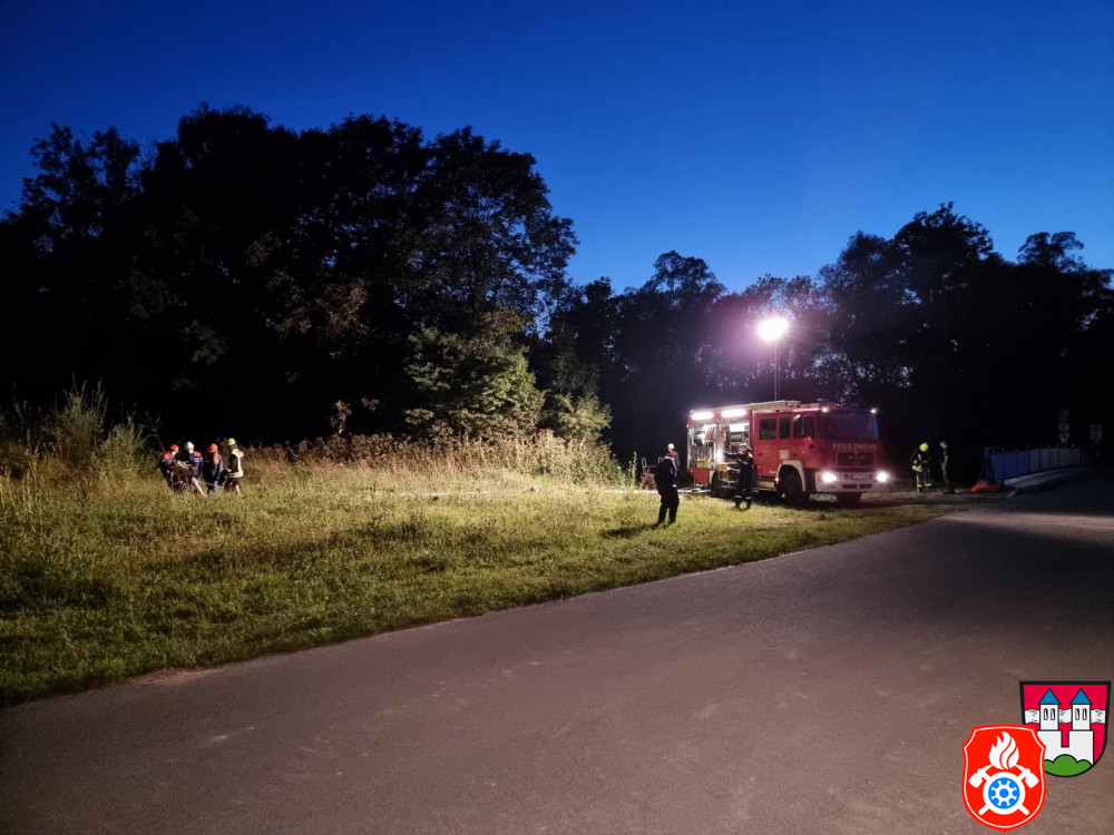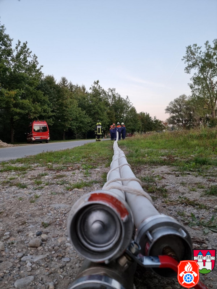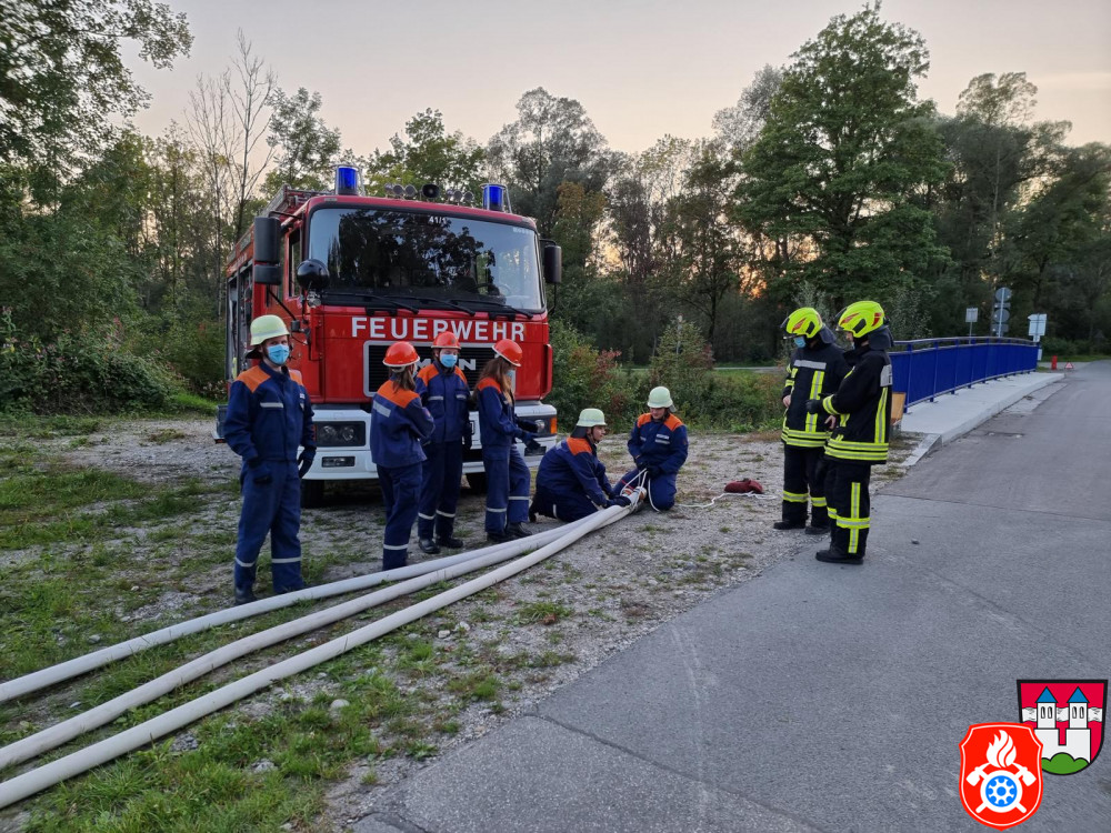 In der Übung waren wir mal wieder sehr dankbar über unsere große Jugendgruppe, da viele Hände benötigt wurden. Wir haben nach Eintreffen an unserer Übungsstelle sofort begonnen eine Verkehrsabsicherung aufzubauen. Gleichzeitig haben wir 2 Feuerwehrler mit Watthose ausgerüstet. Unser Kammeraden hatten jeweils eine Sicherungsperson. Als „Ölsperre“ haben wir insgesamt 3 Schläuche benötigt davon wurden Zwei mit Luft befüllt und der dritte mit Wasser. Das Ganze wurde mit einer Leine zusammengebunden und zu Wasser gelassen. Durch die luftbefüllten Schläuche schwimmt dieses „Paket“ auf dem Wasser und hält somit den Ölfilm zurück.