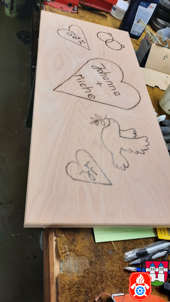 Natürlich haben wir uns auch dazu ein besonderes Geschenk überlegt und viel Zeit dafür investiert. Für die Geschenkübergabe haben wir die beiden mit Sohn zu einem späteren Zeitpunkt zu uns ins Feuerwehrhaus eingeladen. Johanna hatte für uns noch leckeren Kuchen dabei. Es war somit für beide Seiten ein voller Erfolg.