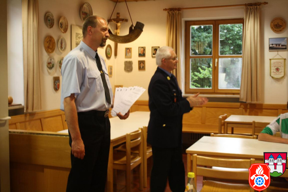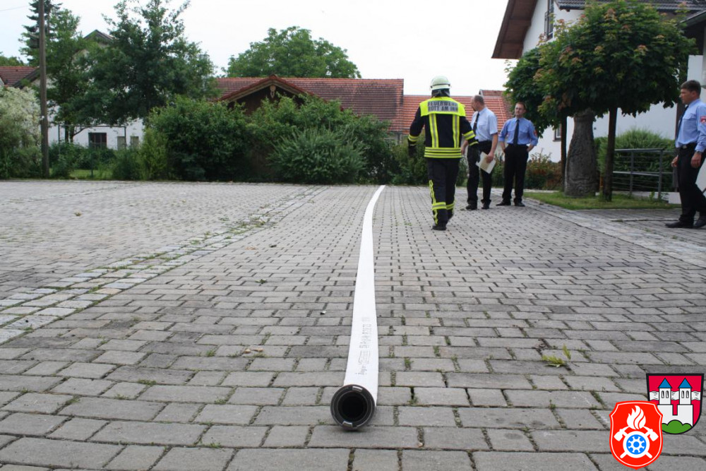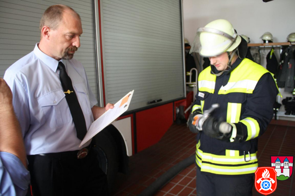 Unter den kritischen Augen von Kreisbrandinspektor Georg Wimmer und Kreisbrandmeister Stefan Hangl bestanden alle 6 Prüflinge die Aufgaben mit Bravur.