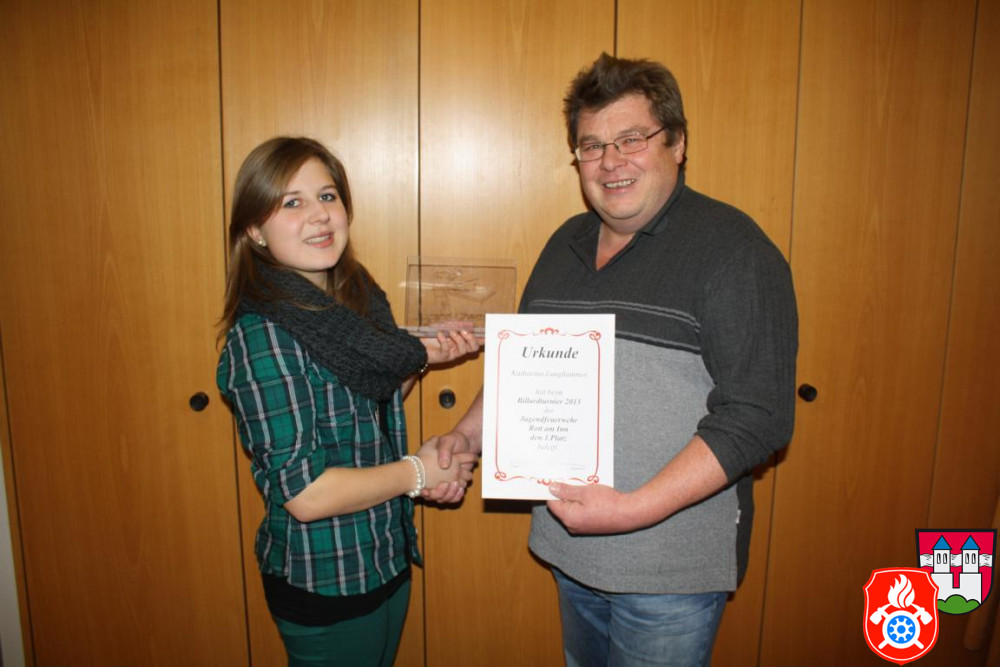 Katharina Lunghammer setzte sich im Finale gegen Alexander Scheidegger durch. Ihre Freude war groß, als ihr der Pokal und eine Urkunde vom 1. Jugendwart Herbert Lunghammer überreicht wurde.