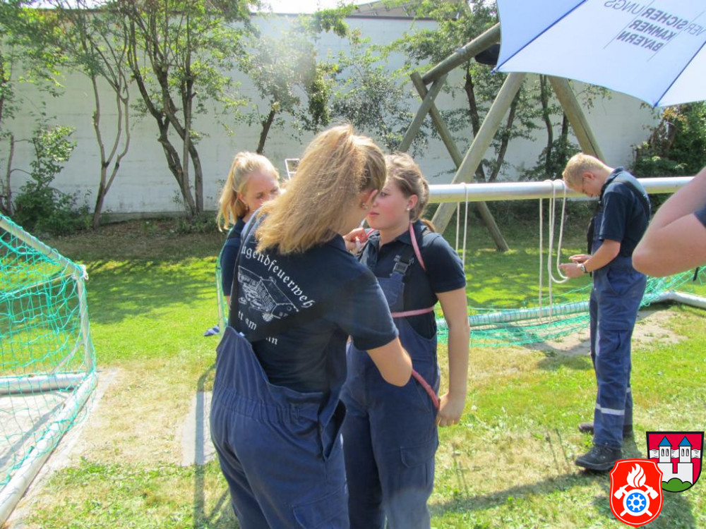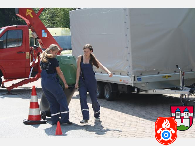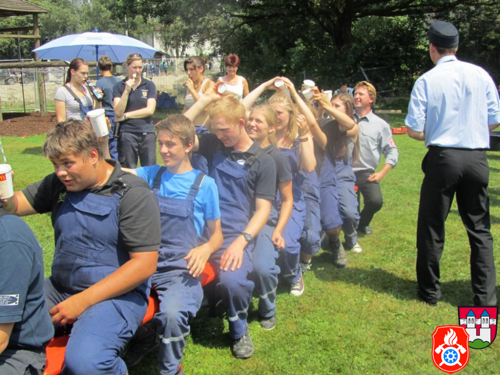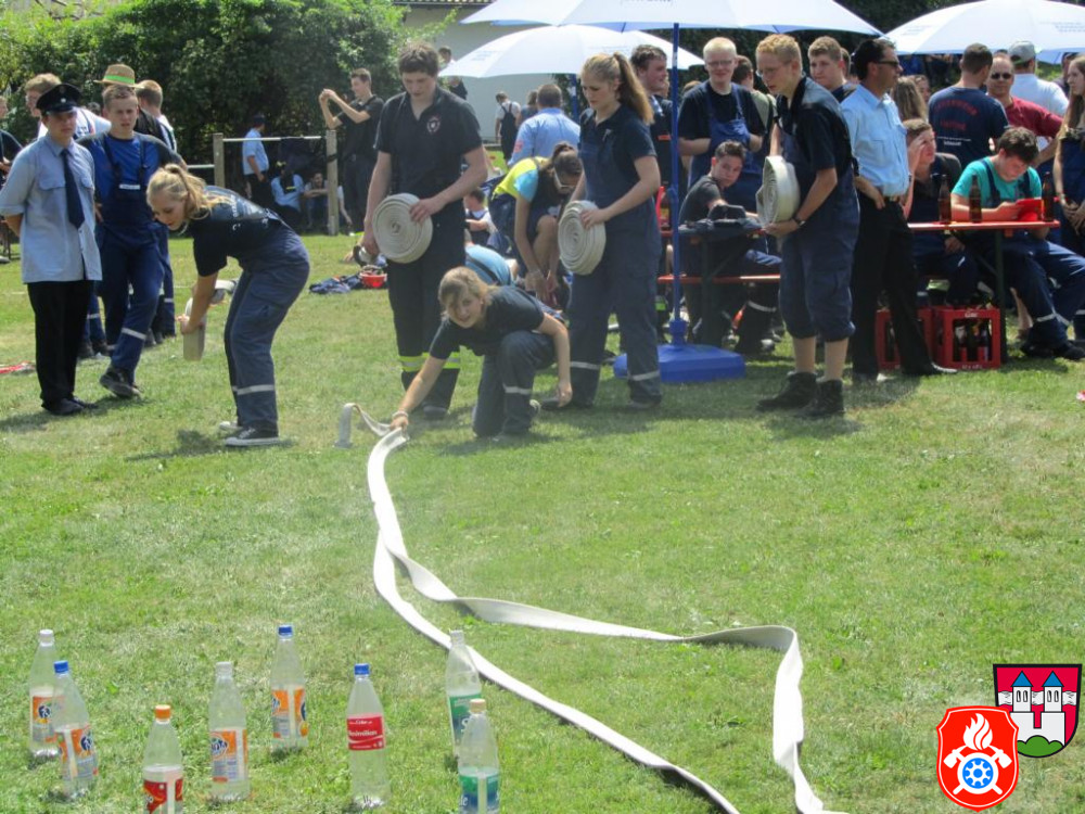 Typisch feuerwehrspezifische Aufgaben wie das korrekte Anfertigen von Knoten unter Zeitdruck, das Ausrollen von Feuerwehrschläuchen oder Leinenzielwurf wurden hier ergänzt durch ungewöhnliche und stets gemeinsam zu bewältigende Herausforderungen.