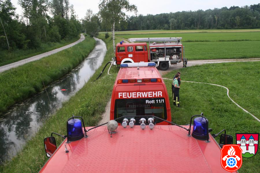 Wir fuhren mit den Fahrzeugen 11/1, 21/1 und 44/1 zu einem Bach in der Nähe der Inn- Staustufe und pumpten dort