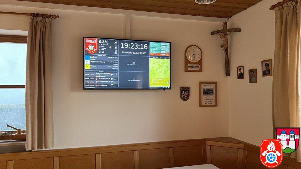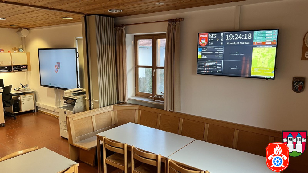 Auch der Aufenthaltsraum/das Stüberl verfügt jetzt über einen neuen 55-Zoll Bildschrim. Auf diesen kann das Bild vom großen Touchbildschirm des Schulungsraumes dupliziert werden, so dass bei größeren Veranstaltungen und Vollversammlungen mit geöffneter Trennwand eine zweite Möglichkeit der Bildbetrachtung für die Zuschauer der rechten Raumseite besteht. Zudem verfügt der Bildschirm über die Anzeige unseres Alarmmonitores und über weitere Möglichkeiten der Bildübertragung per Laptop, Smartphone, Receiver, etc.