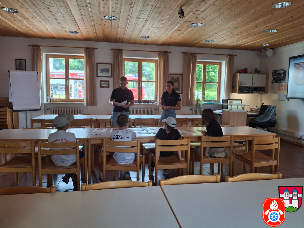 Ebenfalls übten sie wie man einen Notruf richtig absetzt, denn schnelle und präzise Informationen können Leben retten. Ein besonderes Highlight war die Fahrt im Feuerwehrauto: Mit Blaulicht und Martinshorn ging es zum Übungsplatz, wo gemeinsam ein Löschangriff aufgebaut wurde. Dabei durfte natürlich auch selbst mit Wasser gespritzt werden – ein Spaß, bei dem niemand trocken blieb.
