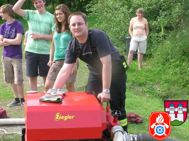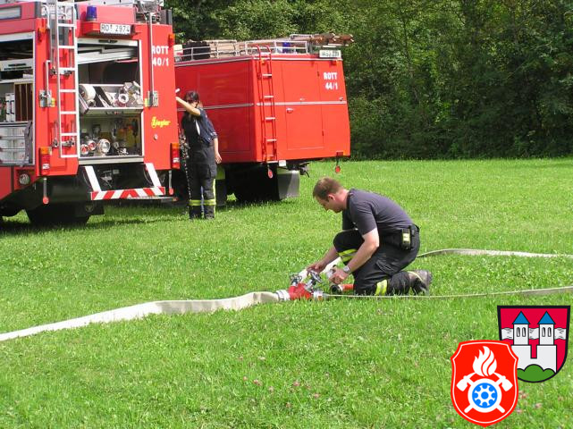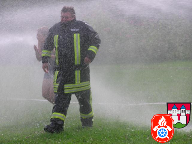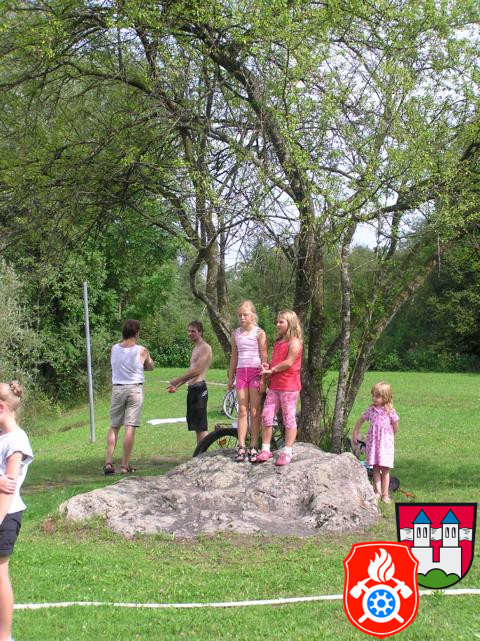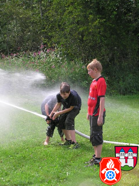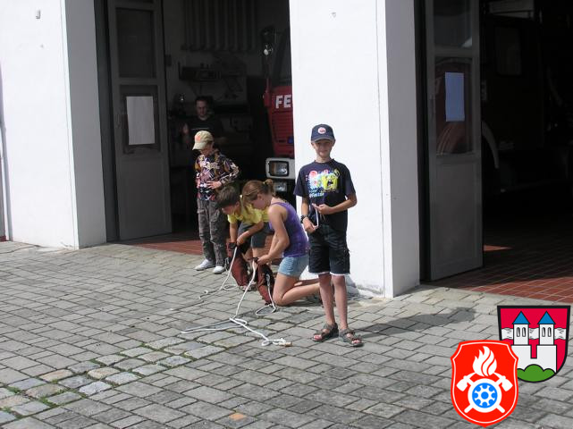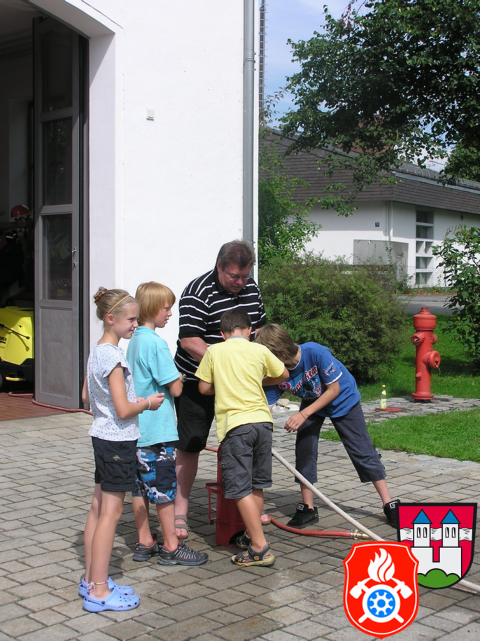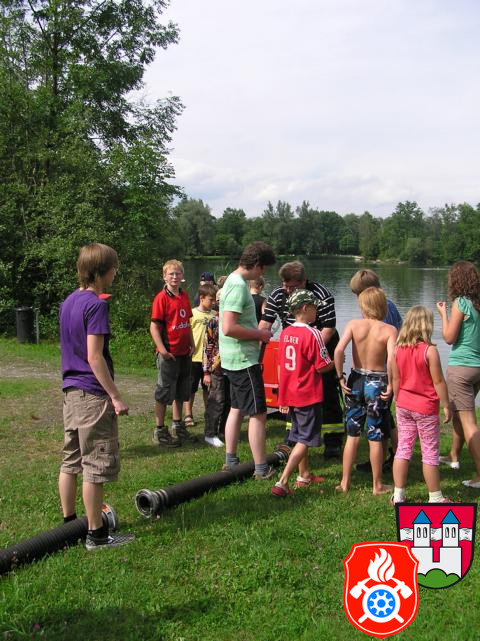 Trotz der vielen verregneten Vortage, erstrahlte auch dieses Jahr wieder herrlicher Sonnenschein bei warmen Temperaturen. 16 Kinder wollten einen Nachmittag lag Feuerwehrmann/-frau sein. Das Ferienprogramm begann mit einer Führung durchs Feuerwehrhaus und Besichtigung der Einsatzfahrzeuge und deren Ausrüstung. Im Anschluss wurden verschiedene Spiele gemacht, wie zum Beispiel Schlauch ausrollen, Leinenzielwurf und spritzen mit der Kübelspritze, sowie auch das durchqueren der Kriechstrecke, machte den Kindern großen Spaß. Nach den Spielen fuhren wir zum Rotter Ausee und machten einen Löschaufbau, wo natürlich alle Kinder selbst spritzen durften. Der Wasserspaß gefiel den Kindern sehr gut, außerdem war es eine wohltuende Abfrischung. Zum Abschluss des Tages gab es im Feuerwehrhaus noch eine Brotzeit und jedes Kind bekam eine Urkunde.