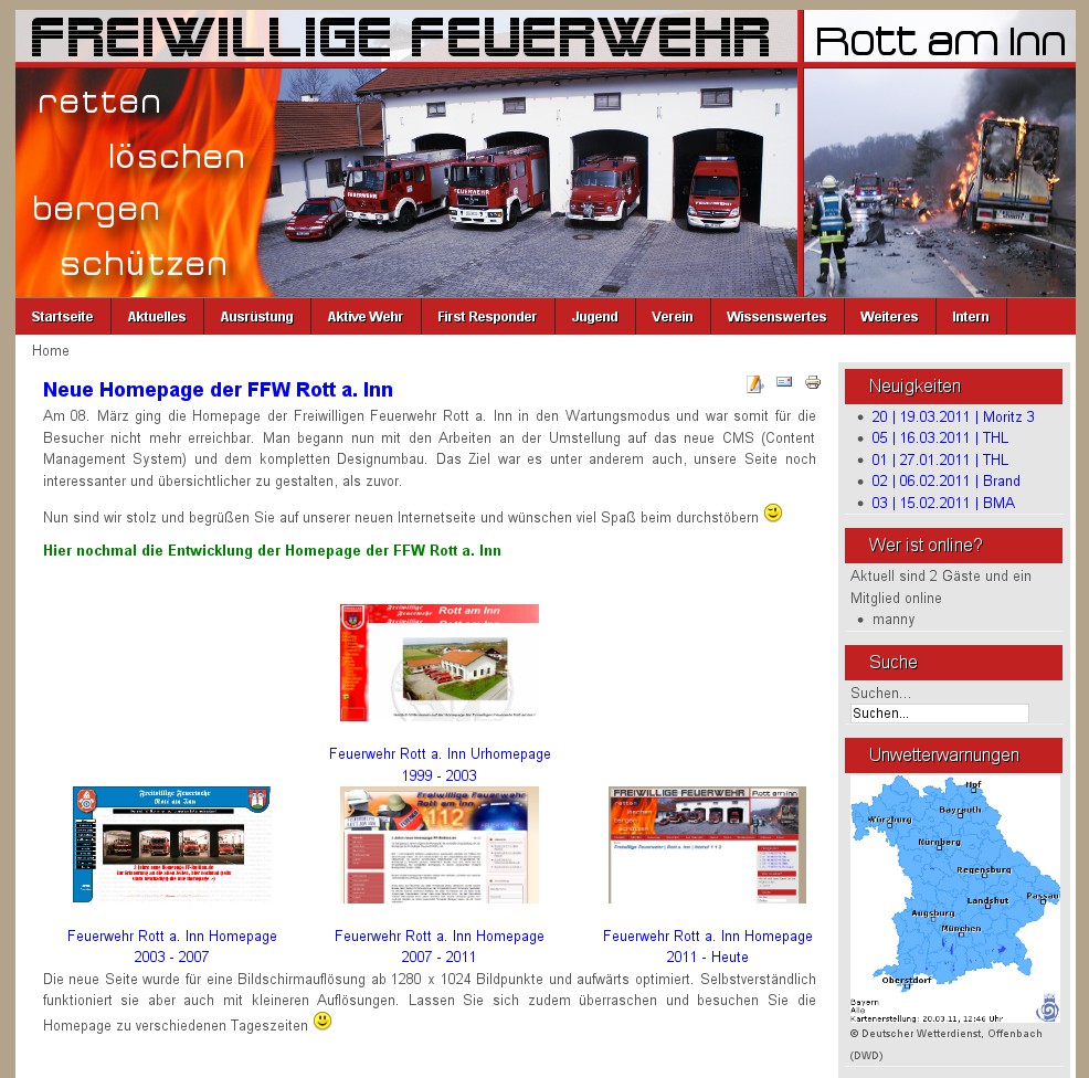 Am 08. März ging die Homepage der Freiwilligen Feuerwehr Rott a. Inn in den Wartungsmodus und war somit für die Besucher nicht mehr erreichbar. Man begann nun mit den Arbeiten an der Umstellung auf das neue CMS (Content Management System) und dem kompletten Designumbau. Das Ziel war es unter anderem auch, unsere Seite noch interessanter und übersichtlicher zu gestalten, als zuvor.