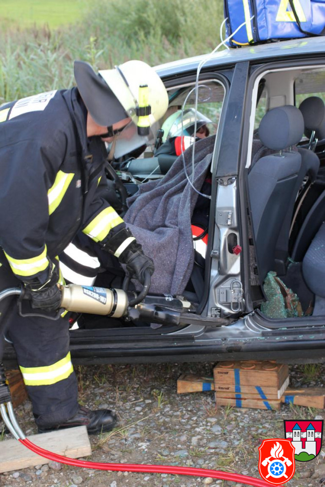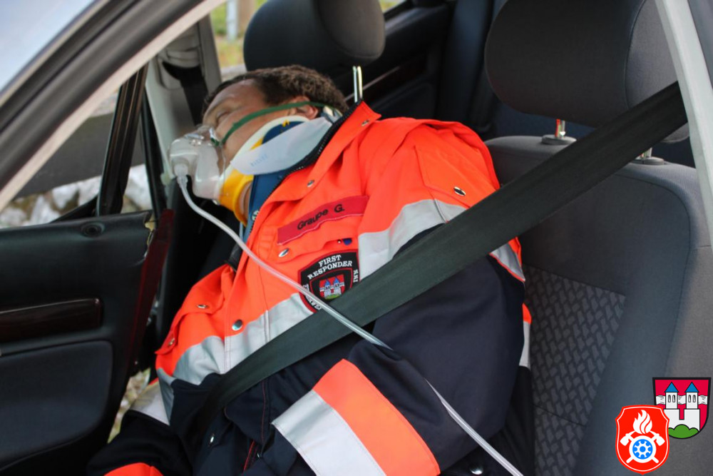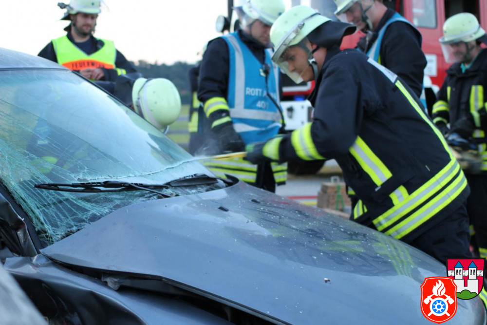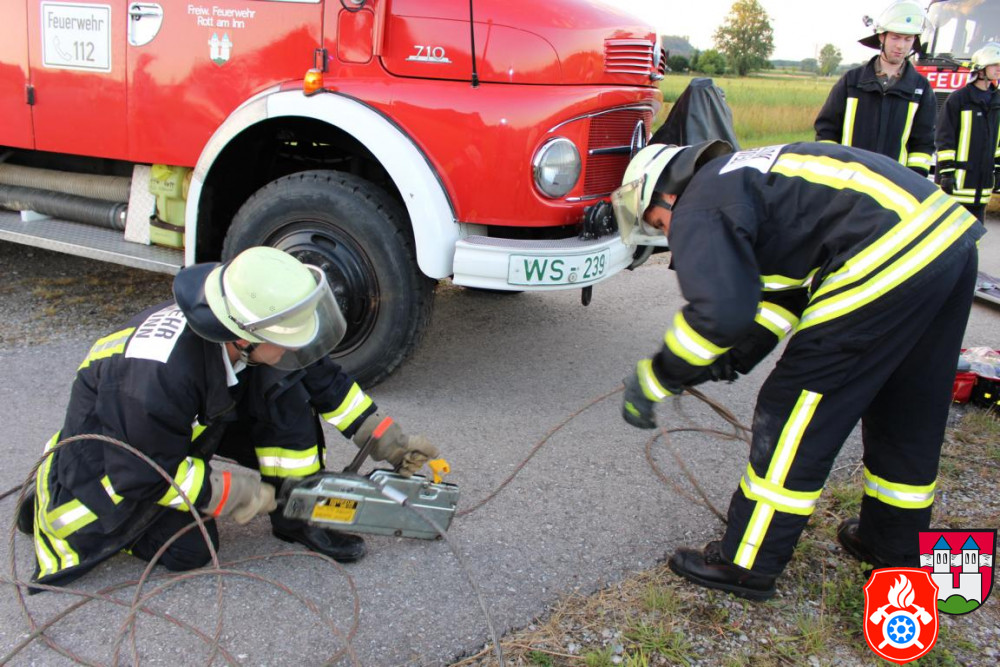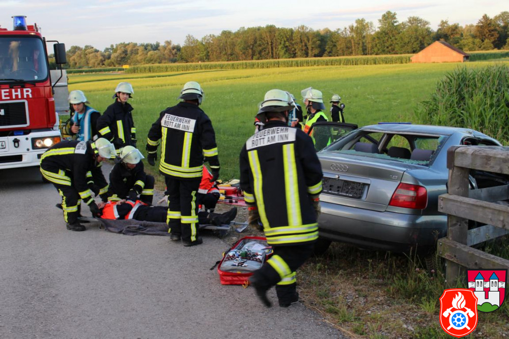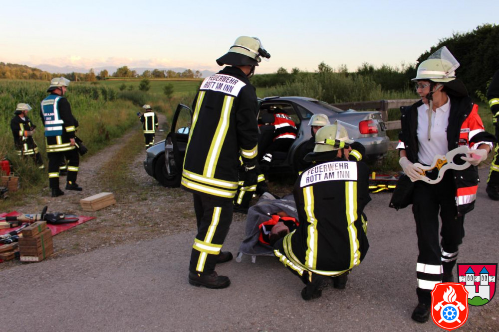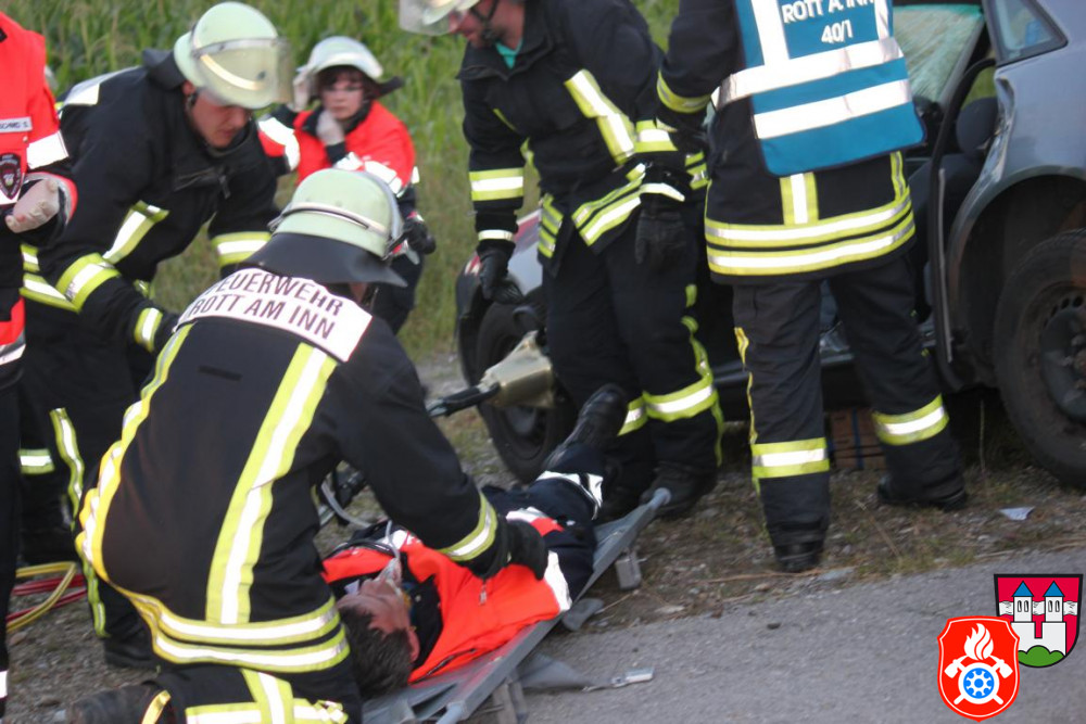 Unter realistischen Voraussetzungen erreichten die First Responder als Erstes den Unfallort. Doch bereits wenige Minuten später trafen die Fahrzeuge der Freiwilligen Feuerwehr Rott a. Inn am Unfallort ein. Die schnelle Lageüberprüfung der Gruppenführer, sowie der First Responder brachte folgendes Ergebnis: Im Fahrzeug waren zwei schwer verletzte, eingeklemmte Personen, wovon der Fahrer ansprechbar, sein Beifahrer jedoch bewusstlos war. Nach Aussagen des PKW-Fahrers mussten auch noch zwei Fahrradfahrer beteiligt gewesen sein, die aber nicht sofort auffindbar waren. Deswegen wurde, parallel zu den weiteren Rettungsarbeiten, eine sofortige Vermisstensuche eingeleitet. Leider wurde die Suche durch umliegende Maisfelder erschwert. Der Einsatz der neuen Wärmebildkamera der Feuerwehr vereinfachte jedoch die Suche deutlich, da diese die Wärmesignaturen der verletzten Radfahrer im Maisfeld anzeigte. Beim PKW-Fahrer erfolgte eine sofortige basismedizinische Erstversorgung mit permanenter Überwachung der Vitalwerte.