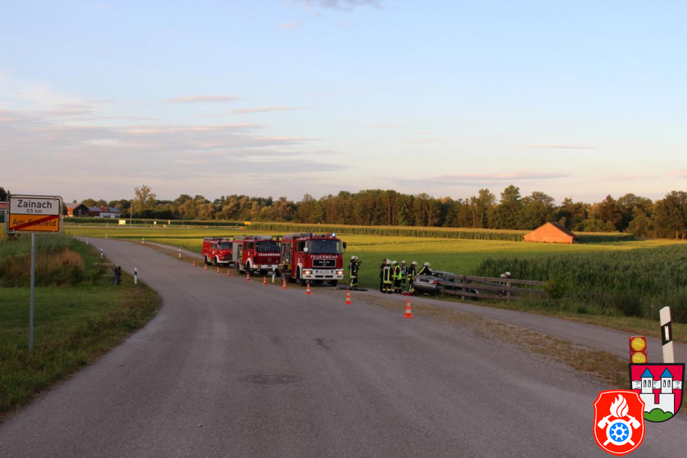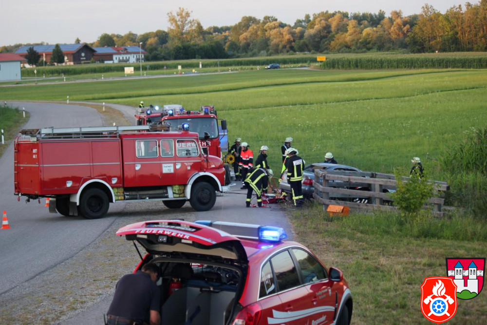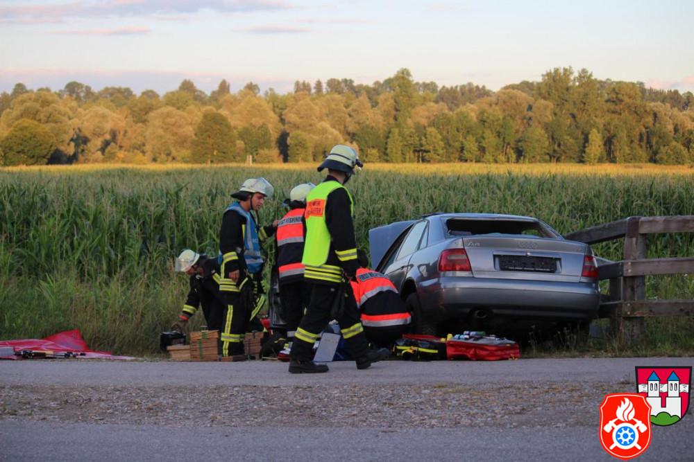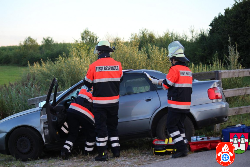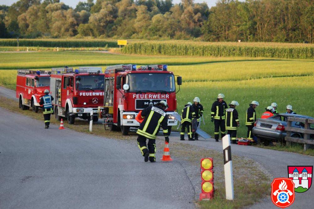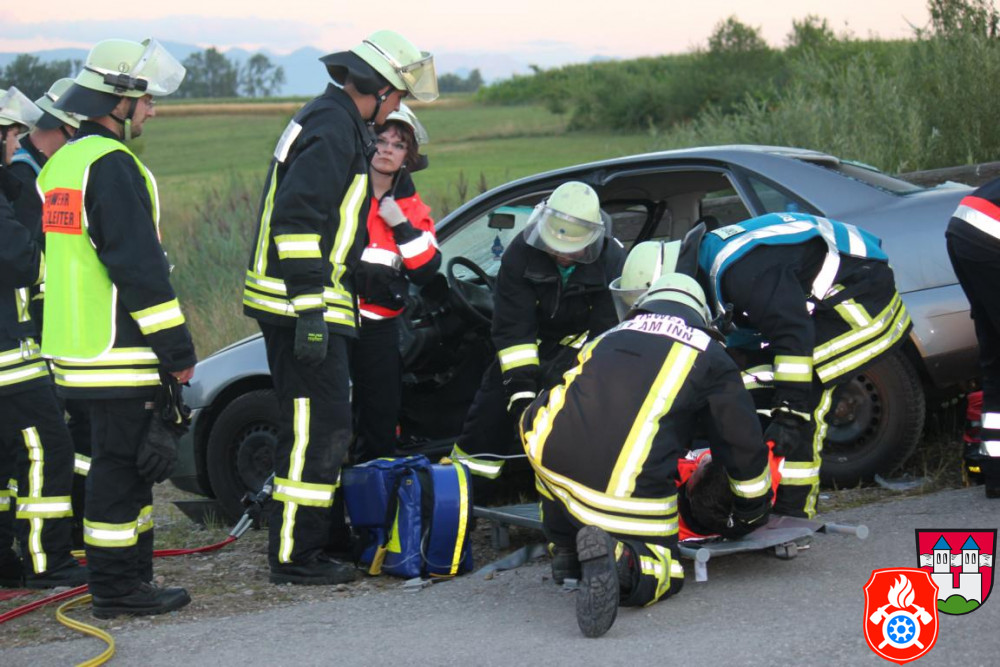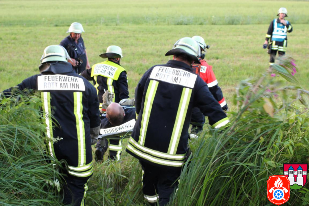 Unter realistischen Voraussetzungen erreichten die First Responder als Erstes den Unfallort. Doch bereits wenige Minuten später trafen die Fahrzeuge der Freiwilligen Feuerwehr Rott a. Inn am Unfallort ein. Die schnelle Lageüberprüfung der Gruppenführer, sowie der First Responder brachte folgendes Ergebnis: Im Fahrzeug waren zwei schwer verletzte, eingeklemmte Personen, wovon der Fahrer ansprechbar, sein Beifahrer jedoch bewusstlos war. Nach Aussagen des PKW-Fahrers mussten auch noch zwei Fahrradfahrer beteiligt gewesen sein, die aber nicht sofort auffindbar waren. Deswegen wurde, parallel zu den weiteren Rettungsarbeiten, eine sofortige Vermisstensuche eingeleitet. Leider wurde die Suche durch umliegende Maisfelder erschwert. Der Einsatz der neuen Wärmebildkamera der Feuerwehr vereinfachte jedoch die Suche deutlich, da diese die Wärmesignaturen der verletzten Radfahrer im Maisfeld anzeigte. Beim PKW-Fahrer erfolgte eine sofortige basismedizinische Erstversorgung mit permanenter Überwachung der Vitalwerte.