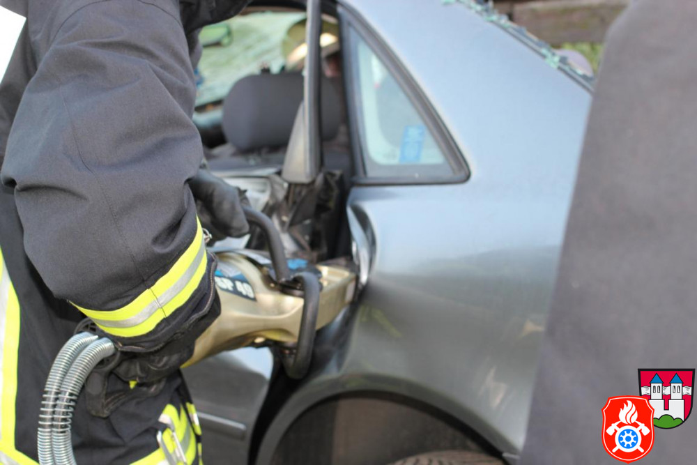Der am Abhang stehende PKW wurde mit Unterbaumaterial und Seilzug gesichert, sodass zügig mit den Rettungsarbeiten begonnen werden konnte. Mit Spreiz- und Schneidgerät, sowie mit weiteren Materialien konnte der eingeklemmte und mittlerweile bewusstlose PKW-Fahrer befreit werden. Auch in weiteren Aufgaben übten sich die Aktiven der Feuerwehr, wie z.B. Tragehilfe, Verkehrsregelung und Brandsicherung.