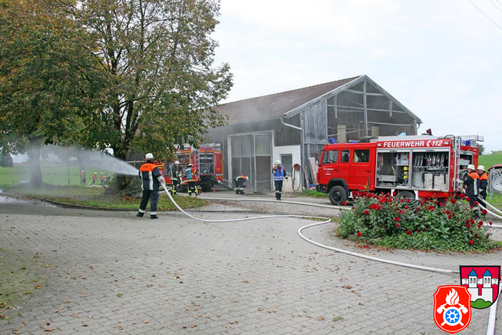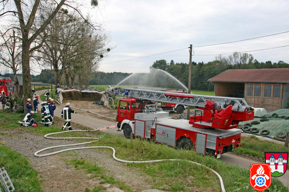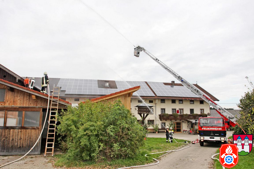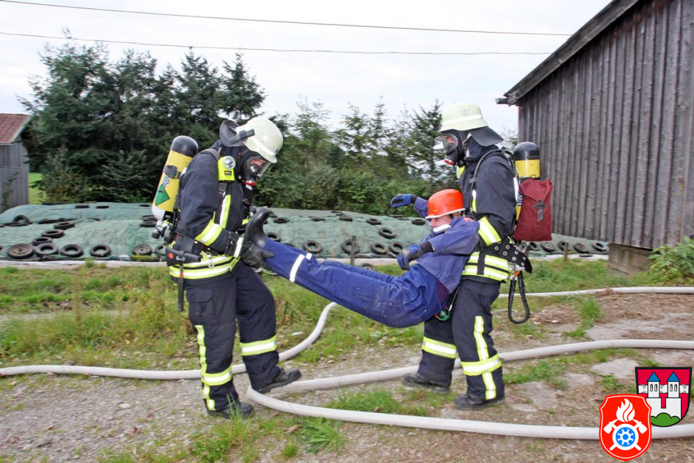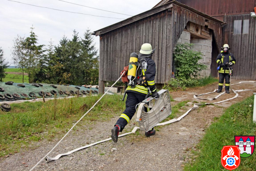 Nachbarfeuerwehren, um den Ernstfall eines Bauernhofbrandes in Aitermoos zu üben.