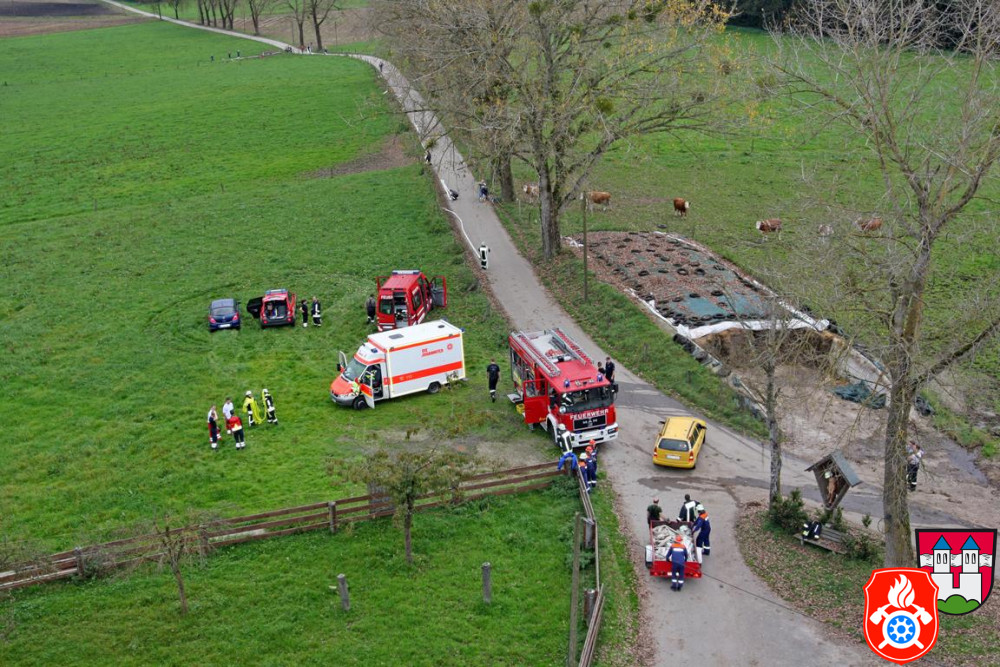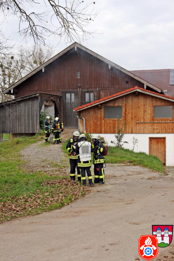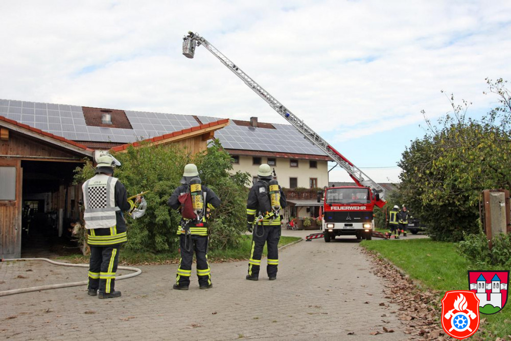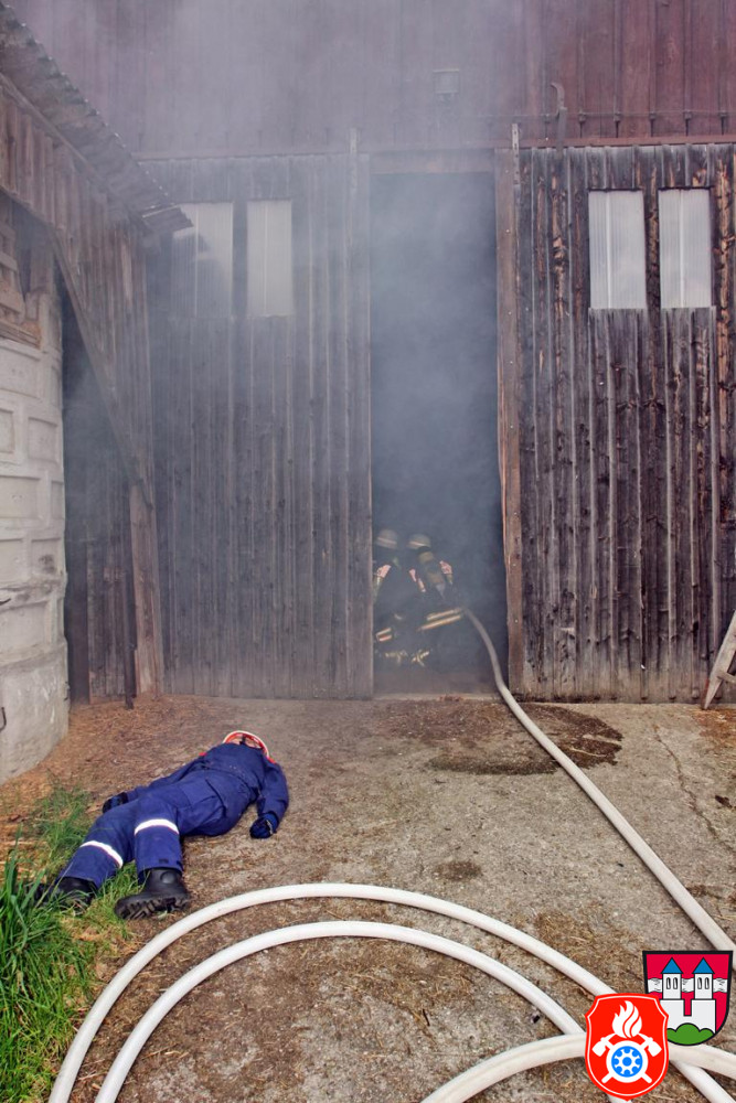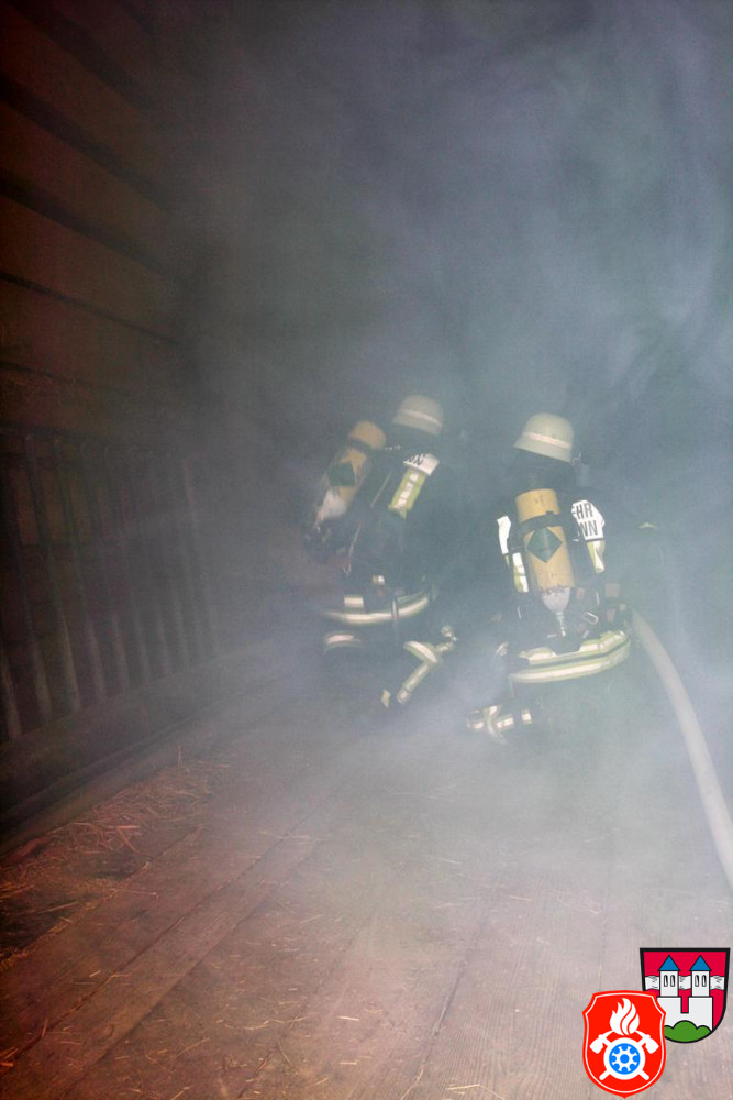 Nachbarfeuerwehren, um den Ernstfall eines Bauernhofbrandes in Aitermoos zu üben.