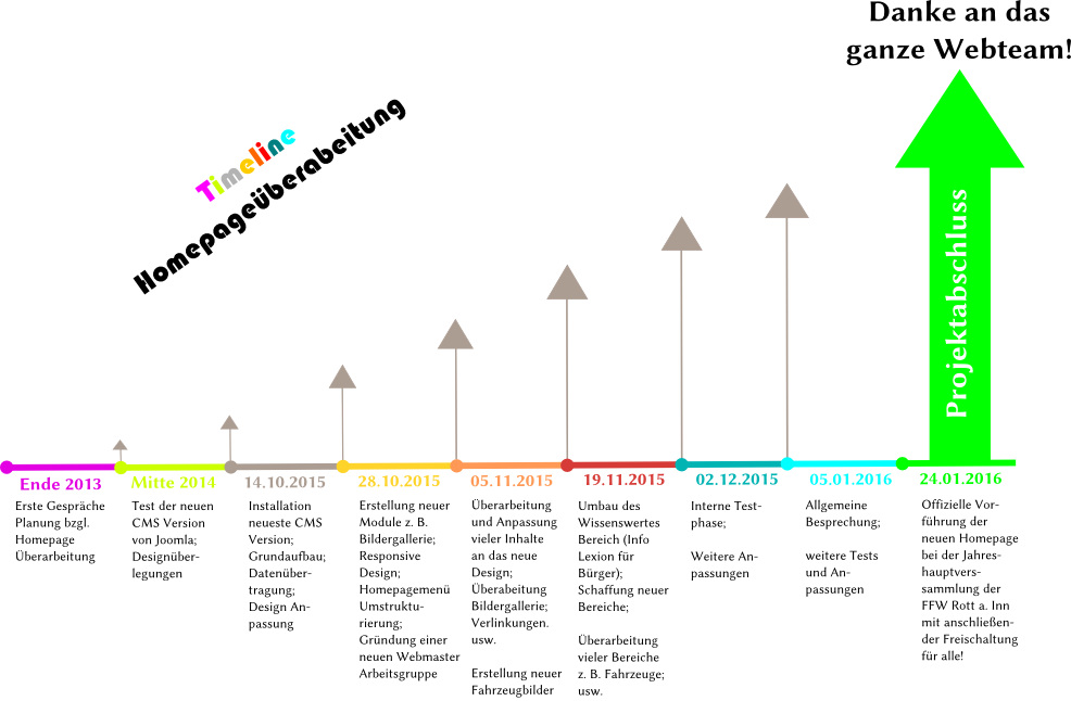 Bereits vor mehreren Monaten begann eine erste Planungsphase zur Überarbeitung der Homepage. In den darauffolgenden Monaten und Wochen wurde dann in Gruppenarbeit von vier Leuten die komplette Seite der Freiwilligen Feuerwehr Rott a. Inn überarbeitet. Die Gesamtstunden für dieses Projekt beliefen sich auf 800. Das Webteam hat diese Arbeit ehrenamtlich in der Freizeit verrichtet.