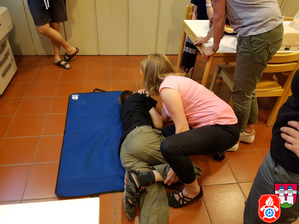 Die Teilnehmer hatten auch die Möglichkeit verschiedene Erste Hilfe Maßnahmen zu üben, wie z. B. die Wiederbelebung oder das Durchführen einer stabilen Seitenlage. Zudem standen unsere First Responder auch für eine Fragen und Antworten Runde zur Verfügung, um offene Fragen zu beantworten.