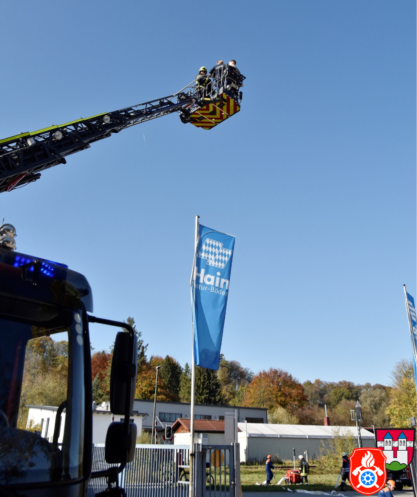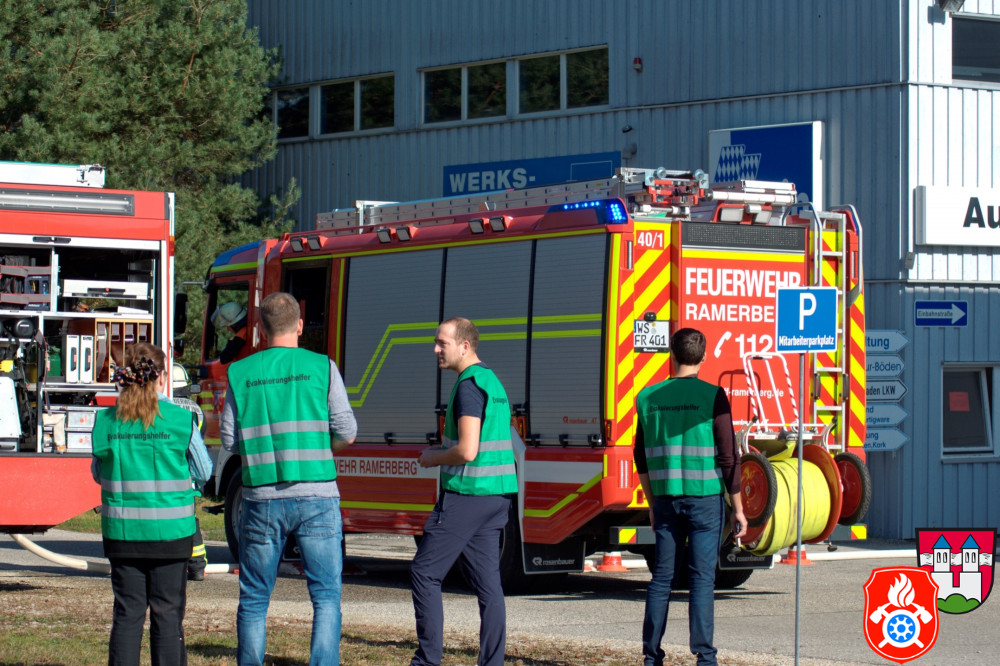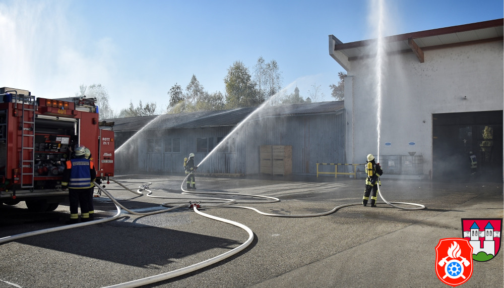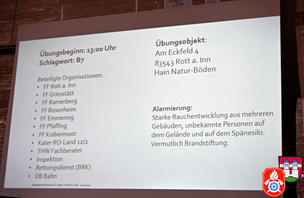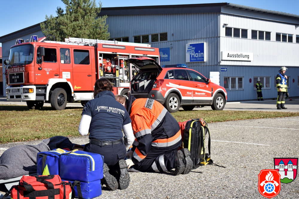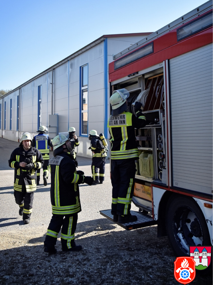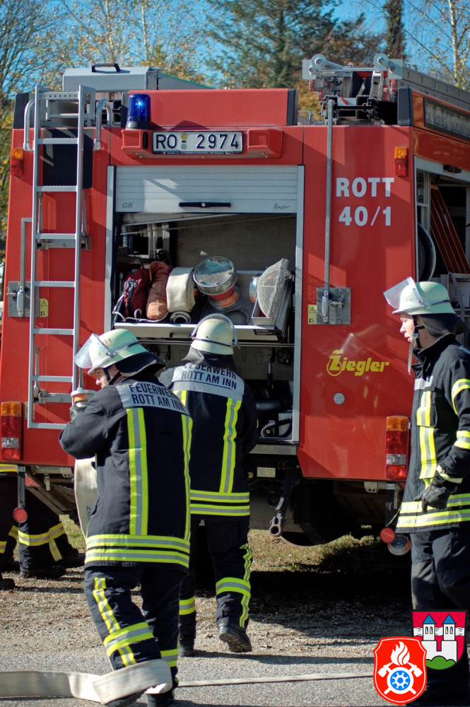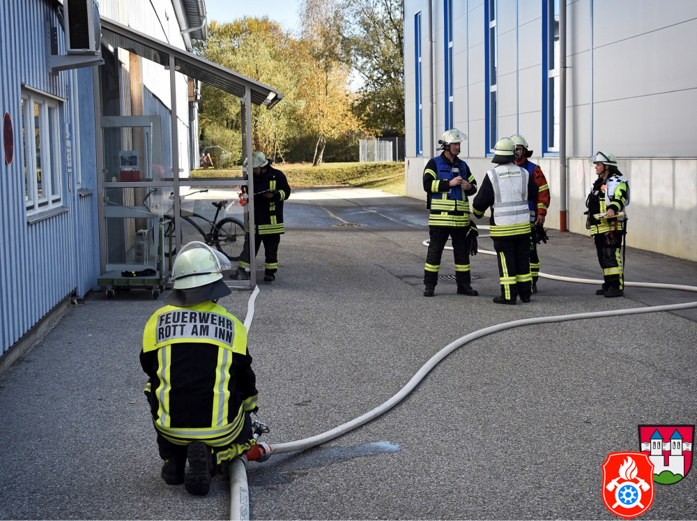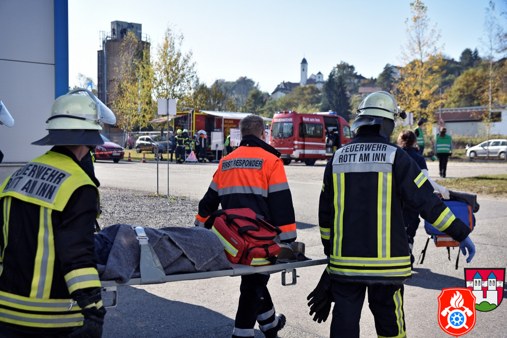 Ein großes Aufgebot an Einsatzkräften aus den Landkreisen Rosenheim und Ebersberg zeichnete am Samstag, den 26.10.2019, das Bild des Rotter Ortsrandes - darunter Feuerwehr, Rettungsdienst und Vertreter des THW. Gemeinsam probte man auf dem Gelände eines holzverarbeitenden Betriebs den Ernstfall.