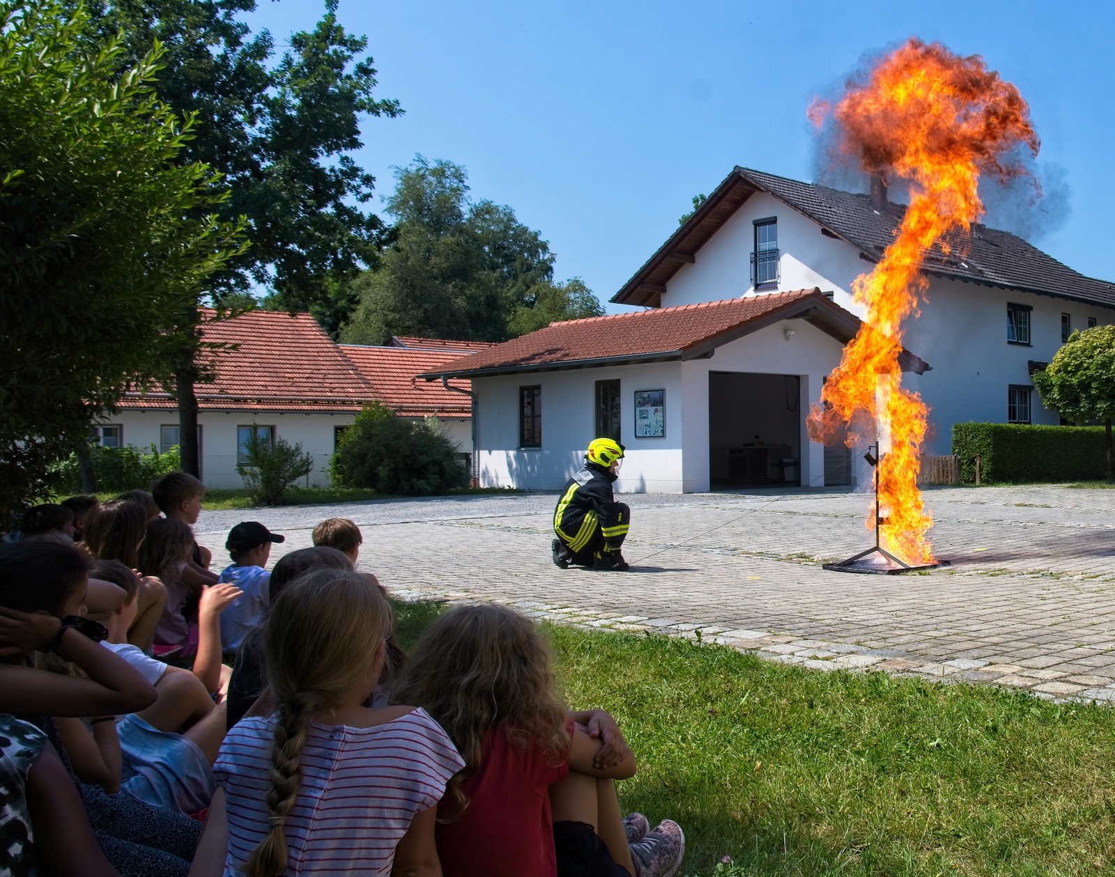 Im der dritten Juli-Woche durften die beiden 4. Klassen der Grund- und Mittelschule Rott am Inn die zwei letzten Unterrichtsstunden des Tages bei uns im Feuerwehrhaus gleich nebenan verbringen. Sie erfuhren viel Interessantes über die Feuerwehr in Rott, die Feuerwehrleute, die Fahrzeuge und alles was es zum Retten, Bergen Löschen und Schützen braucht.
