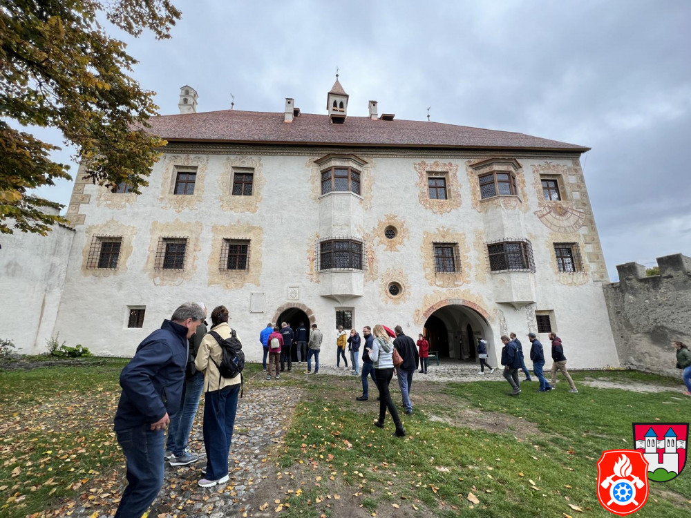 Begonnen haben wir diesen Besuch natürlich am Feuerwehrhaus. Dort besichtigten wir deren Technik und suchten natürlich auch das freundliche Gespräch mit den Kameraden aus Italien. Nach einer kleinen Geschenkübergabe durch unseren ersten Bürgermeister Daniel Wendrock und Vorstand Herbert Lunghammer an den Bürgermeister von Feldthurns, Konrad Messner, ging es für uns zum Schloss Feldthurns. Auch dort erhielten wir eine sehr interessante Führung durch das Anwesen, welches viele Jahrhunderte als Sitz der Fürstbischöfe von Brixen gedient hatte.