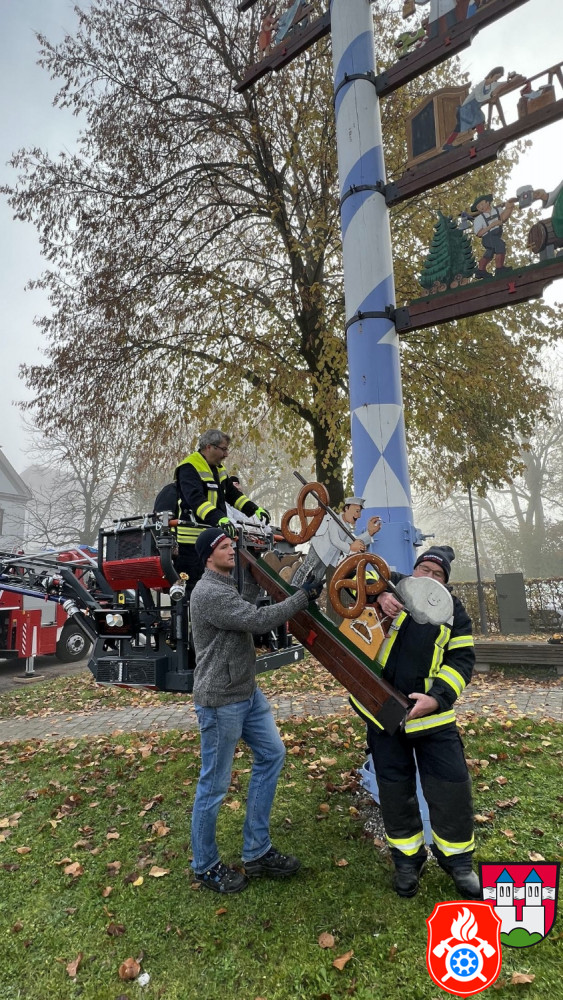 Nun haben wir zusammen mit dem Burschenverein mit unserer Drehleiter die Schilder demontiert und sicher eingelagert. Demnächst wird mit einem Arbeitsgerät der Baum abgetragen. Ein Jahr muss sich die Bevölkerung gedulden, der nächste Baum ist für den 1. Mai 2024 geplant. Dieser wird bestimmt genau so schön wie seine Vorgänger.