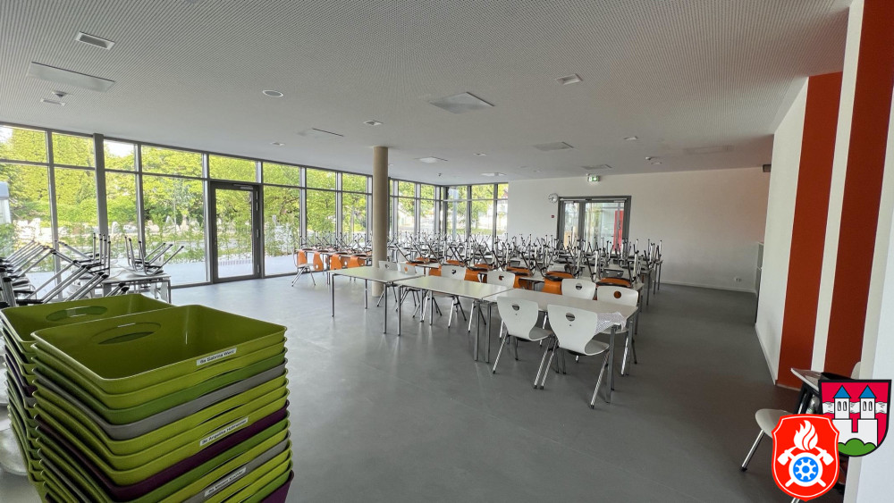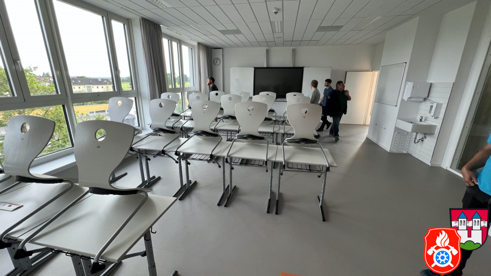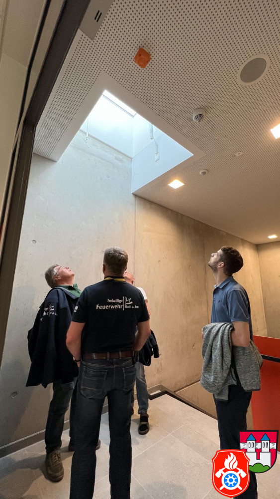 Zusammen mit Peter Perfler vom Bauamt Rott am Inn und Kommandant Manfred Lunghammer trafen wir uns vor dem Gebäude zur Einleitung in die wichtigsten Daten und Zugänge. Dann starteten wir auch direkt los mit der Besichtigung. Im Erdgeschoss ging es über die Mensa gleich in die Aula, in welcher sich die für uns wichtige Bedienung der Brandmeldeanlage befindet. Die Steuerung ist genormt und auch in anderen Rotter Großgebäuden so zu finden. In dieser befinden sich auch vorbereitete Gebäude- sowie Melderpläne, welche uns im Einsatzfall sehr behilflich sind.