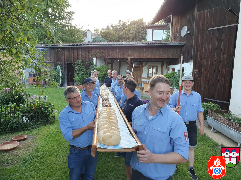 Dort angekommen wurde das Gebäckstück, liegend und befestigt auf einer Leiter, von unseren Aktiven per Hand hochgestemmt und versucht dieses irgendwie in das Haus zu befördern. Dies klappte aber (gewollt) nicht auf Anhieb. Mehrere Versuche und Messungen waren nötig, um schließlich das Brot samt Geschenken für die Kinder zu übergeben. Feierlich wurden wir anschließend auf eine kleine Brotzeit in der Garage eingeladen.