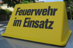 Kennen Sie dieses Schild? Was auf den ersten Blick aussieht wie eine Infotafel eines Taxis ist in diesem Fall jedoch ganz was anderes. In schwarzer Schrift steht auf gelber Untergrundfarbe der Text "Feuerwehr im Einsatz". Dies ist aber das einzigste Merkmal, dass von außen auf die Feuerwehr hindeutet. Der Grund: Beim Fahrer handelt es sich um eine aktive Einsatzkraft im Privatfahrzeug, welches gerade untwerwegs zum Feuerwehr-Gerätehaus oder zum Einsatz ist.