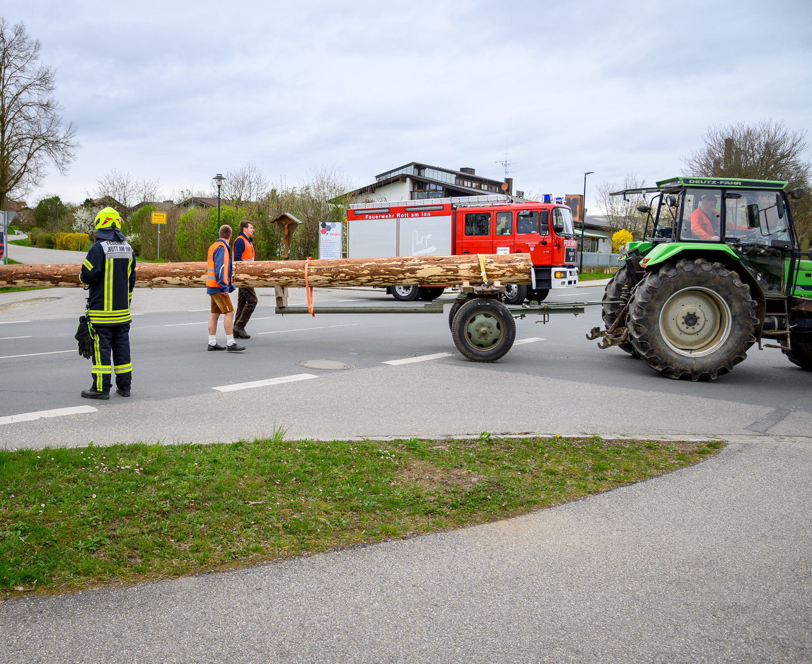 Schnell verging die Zeit. Erst 2019 haben wir - die Feuerwehr - zusammen mit dem Burschenverein den Maibaum vorbereitet, bewacht und im Ortszentrum aufgestellt. Dieses Jahr ist es wieder soweit, es gibt ein neues Brauchtumsstangerl. Unter der Regie von Trachten- und Burschenverein erhält Rott am Inn ein neues Prachstück für den Marktplatz. Am 01.04.2024 wurde der Baum, welcher bereits im Dezember 2023 gefällt wurde, von seinem Winterquartier in das Maibaumstüberl befördert. Die Feuerwehr unterstützte die beiden Ortsvereine bei der Verkehrsabsicherung.