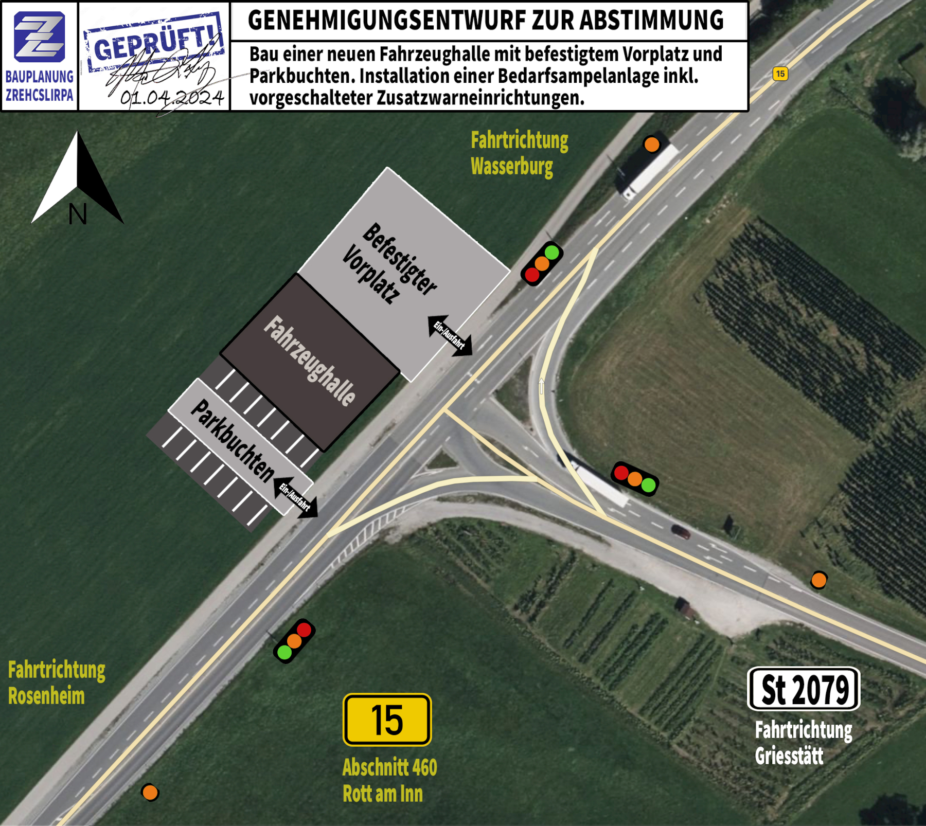Stammkundschaft. Dieses Wort trifft es wahrscheinlich ganz gut. Gemeint sind hierbei wir - die Feuerwehr Rott am Inn - und die zugehörige Stamm-Örtlichkeit ist ein echter Klassiker. Es handelt sich um den Straßenabschnitt 460 der Bundesstraße 15 mit der Abzweigung zur Staatstraße 2079 nach Griesstätt. Aufgrund vieler unterschiedlicher Faktoren zählt der Abschnitt der B15 zu einer der gefährlichsten Strecken Bayerns (Quelle: Bayerische Staatszeitung). Wegen der hohen Einsatzzahlen und den daraus resultierenden Arbeitsstunden wurde nun endlich reagiert. Direkt an der Unglückskreuzung ist nun ein Neubau eines zusätzlichen Gerätehauses mit zwei Fahrzeug-Stellplätzen geplant.