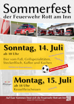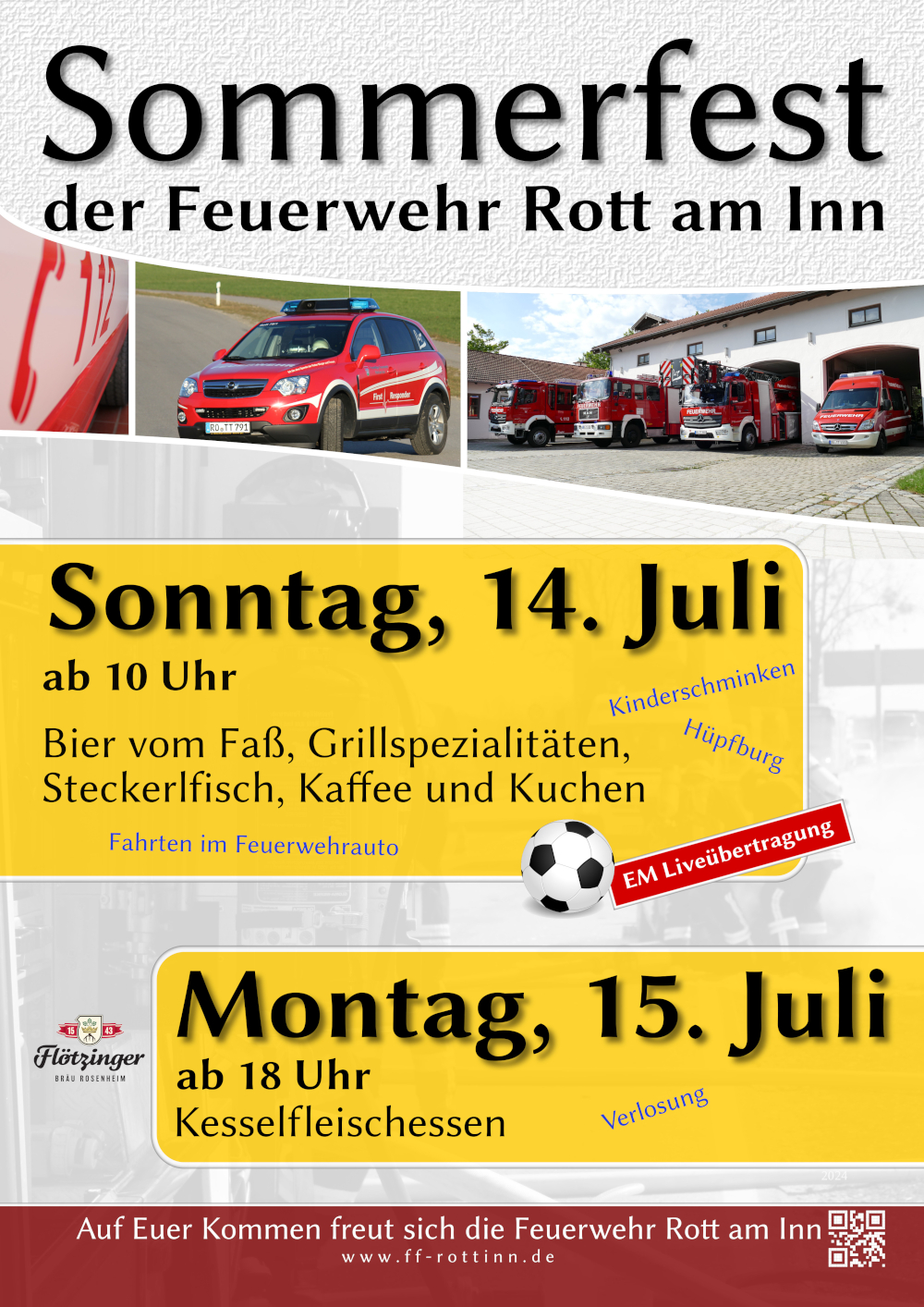 Bald ist es endlich wieder soweit. Am 14. und 15. Juli veranstalten wir wieder unser großes Sommerfest am Feuerwehrhaus. Es gibt wie gewohnt frische Grillspezialitäten, Steckerlfisch, Kaffee und Kuchen sowie beste Getränke aus dem Hause Flötzinger Bräu Rosenheim.