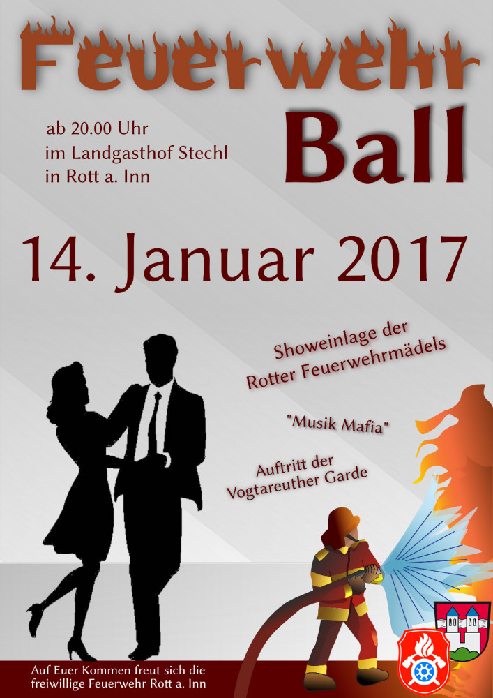 Am 14.01.2017 wurde in Rott wieder richtig gefeiert, denn es fand wieder der alljährliche und traditionelle Feuerwehrball der Freiwilligen Feuerwehr Rott am Inn im Saal des Landgasthof Stechls statt. Dieses Mal waren der Verein besonders stolz darauf, dass alleine über 150 Reservierungen eingegangen sind und letztendlich über 200 Personen bis in die frühen Morgenstunden zu der Musik der Band „Musik Mafia“ getanzt haben. Zur späteren Stunde besuchte dann auch noch die Vogtareuther Faschingsgilde mit Ihrem Prinzenpaar den vollen Saal des „Stechls“ und führten ihre einstudierten Tänze vor.
