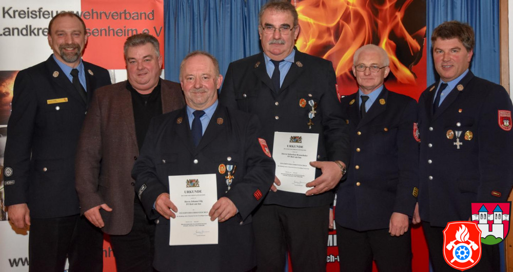 Geehrt wurden heuer vier aktive Feuerwehrler. Darunter Sebastian Brunnthaler sen. und Hans Gilg für 40 Jahre aktiven Dienst. Sie erhielten zum Dank das goldene Ehrenzeichen, sowie eine Urkunde des Freistaates Bayern. Langjährige Mitglieder konnten aufgrund ihrer Abwesenheit leider nicht geehrt werden. 1. Bürgermeister Marinus Schaber bedankte sich von Herzen für den Einsatz eines jeden Aktiven Feuerwehrlers. Wenn die Sirene zu hören ist, dauert es oft nur drei Minuten, bis das erste Martinshorn zu hören ist und man dadurch weiß, dass Hilfe unterwegs ist.