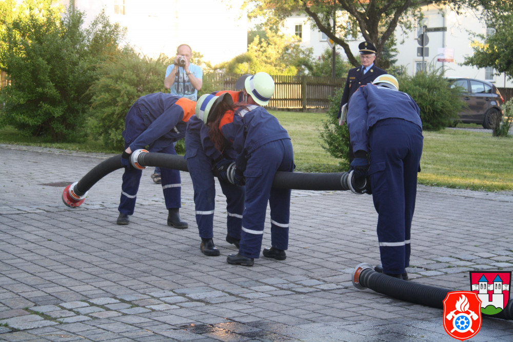 Unter den kritischen Blicken der Schiedsrichter KBI Georg Wimmer, Christian Thomas und Horst Naundorf mussten die Aktiven den Löschaufbau in einer Zeit von maximal 190 Sekunden bewältigen. Weitere Aufgaben waren, eine Saugleitung kuppeln und verschiedene Knoten und Stiche.