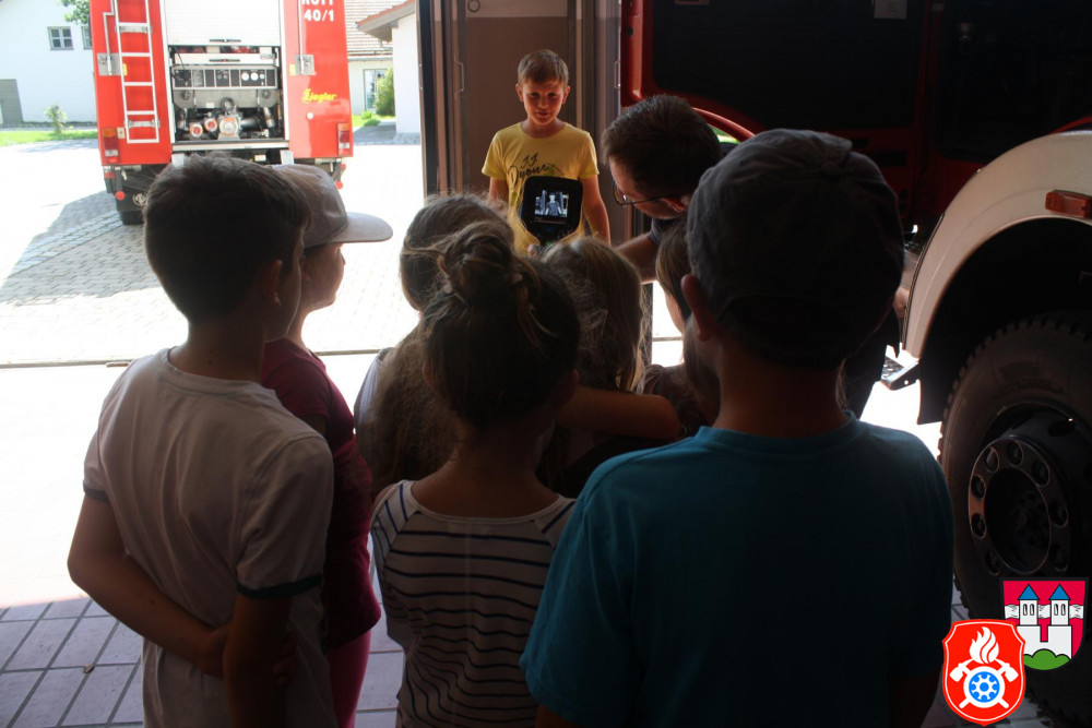 Um 14 Uhr wurden alle Teilnehmer von unserem stellvertretenden Kommandanten Marcus Huber und den zusätzlich 9 anwesenden Kameraden begrüßt. Nach einer kurzen Besprechung über den Ablauf des Nachmittags wurden zwei Gruppen gebildet und mit der Führung durch das Feuerwehrhaus und der Besichtigung der Fahrzeuge und Gerätschaften begonnen. Währenddessen wurden den Kindern viele Fragen, die sie sich schon immer über die Feuerwehr gestellt haben, ausführlich beantwortet.