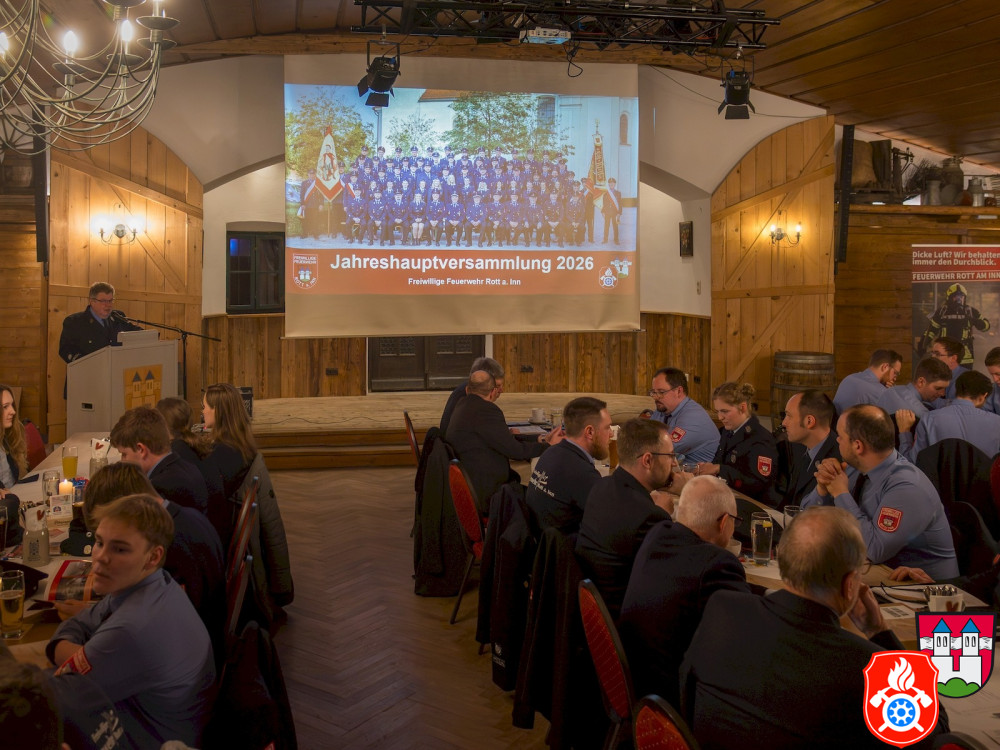 Nach dem Gedenkgottesdienst in der Rotter Kirche konnte die Jahreshauptversammlung der Freiwilligen Feuerwehr Rott a. Inn im Saal des Landgasthofs Stechl pünktlich beginnen. Im Mittelpunkt stand der ausführliche Jahresrückblick auf das Vereins- und Einsatzgeschehen des Jahres 2025. Mehr als 100 Besucher, darunter aktive Mitglieder, Ehrenmitglieder sowie Vertreter der Gemeinde, waren der Einladung gefolgt und zeigten damit ihre enge Verbundenheit mit der Feuerwehr.