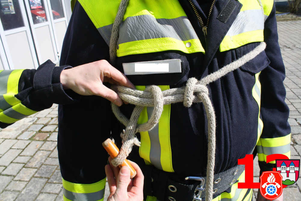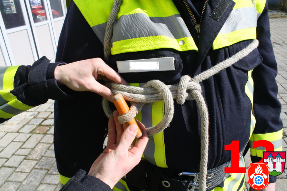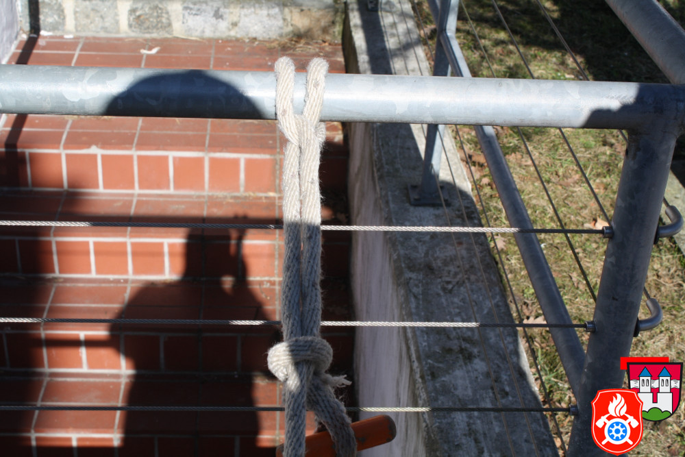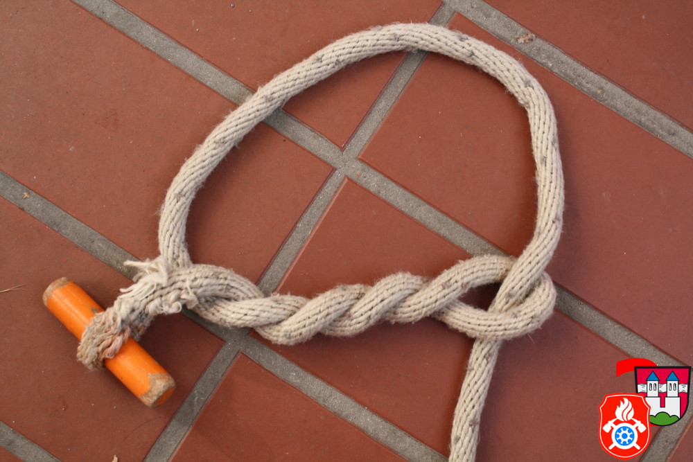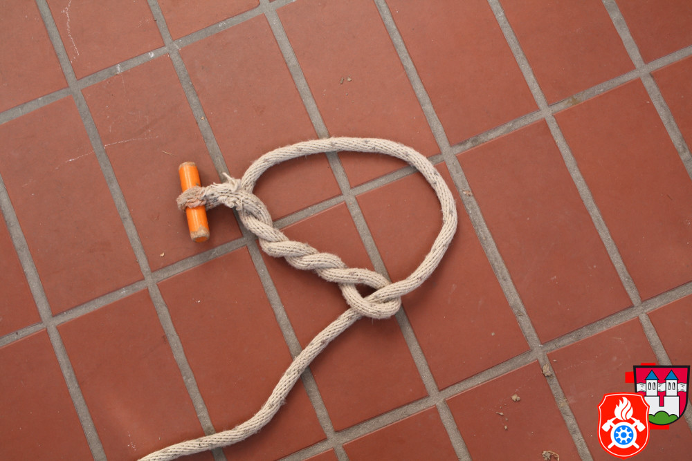 Der Mastwurf an Gegenständen wie z. B. der Feuerwehraxt wird verwendet, um diese sicher in Höhere Ebenen zu ziehen / befördern. Der Mastwurf sichert die Feuerwehraxt ab, damit diese nicht runterfallen kann. Zusätzlich wird am Griff ein Halbschlag angelegt. | |