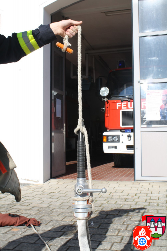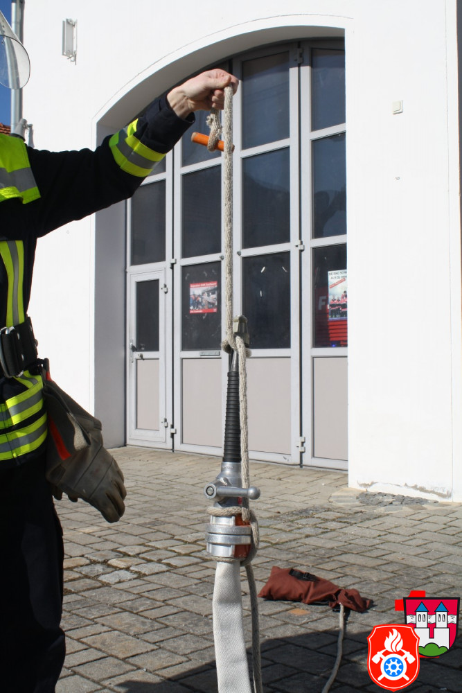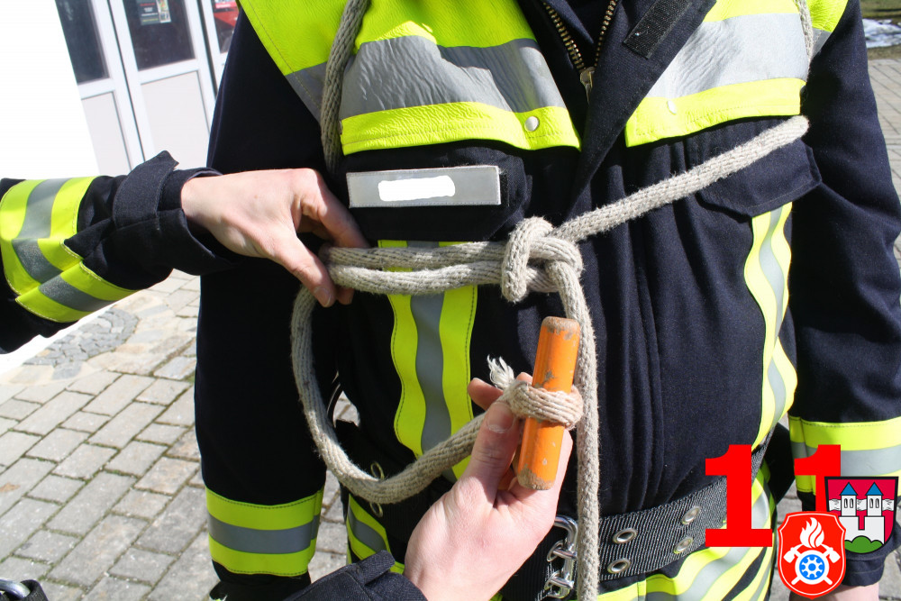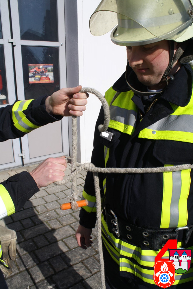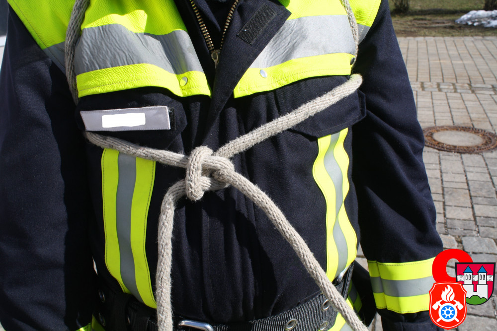 Der Mastwurf an Gegenständen wie z. B. der Feuerwehraxt wird verwendet, um diese sicher in Höhere Ebenen zu ziehen / befördern. Der Mastwurf sichert die Feuerwehraxt ab, damit diese nicht runterfallen kann. Zusätzlich wird am Griff ein Halbschlag angelegt. | |