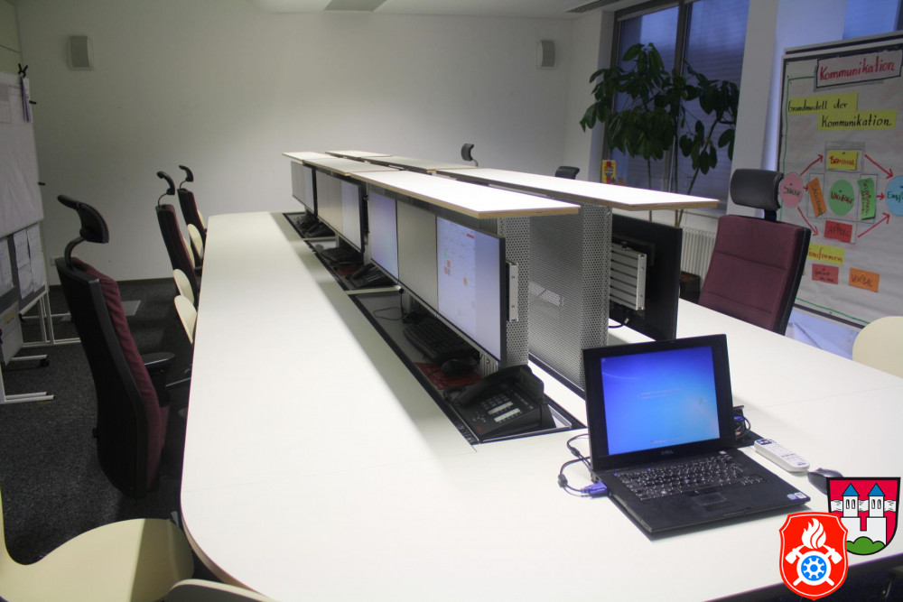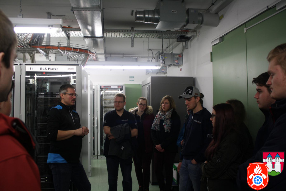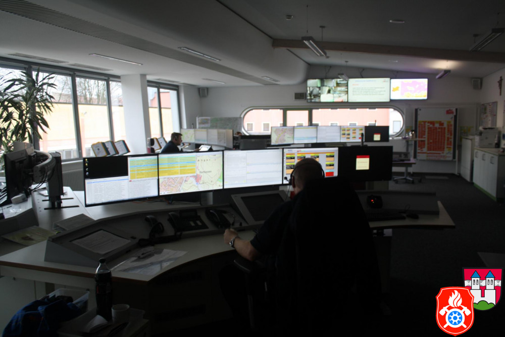 Frisch und munter sind wir bereits um kurz nach neun Uhr mit unseren Fahrzeugen Florian Rott 11/1 und 44/1 nach Rosenheim aufgebrochen. Dort wurden wir dann von dem Dienststellenleiter Thomas Vogl empfangen. Dieser machte mit uns eine Führung durch das moderne Gebäude, welches im Jahr 2007 auf dem Gelände der Freiwilligen Feuerwehr Rosenheim erbaut wurde. Begonnen haben wir die Führung im Erdgeschoss, in welchem sich die Verwaltung, der elektrische Betriebsraum und der Server-/Technikraum befindet. Die ILS Rosenheim verfügt als Sicherheit über zwei Stromzuleitungen und wäre selbst dann, wenn beide Leitungen ausfallen würden, mit einer USV (Ununterbrochenen Stromversorgung) bestehend aus 80 LKW-Batterien für viele Stunden gerüstet. Sollte selbst dies nicht reichen verfügt die angrenzende Freiwillige Feuerwehr Rosenheim noch über ein Diesel-Notstromaggregat, welches für über eine Woche ausreicht. Mit einem Stormverbrauch von 80 kVA ist dies nicht zu unterschätzen.