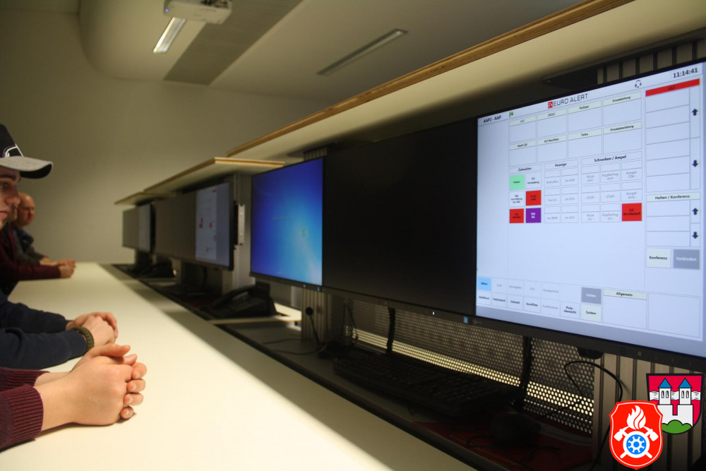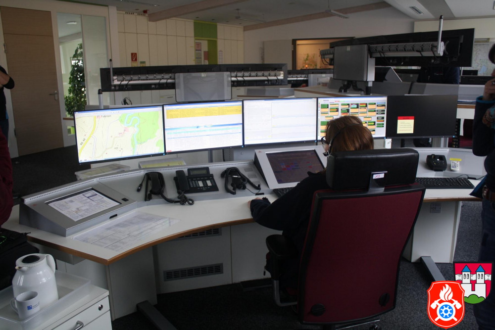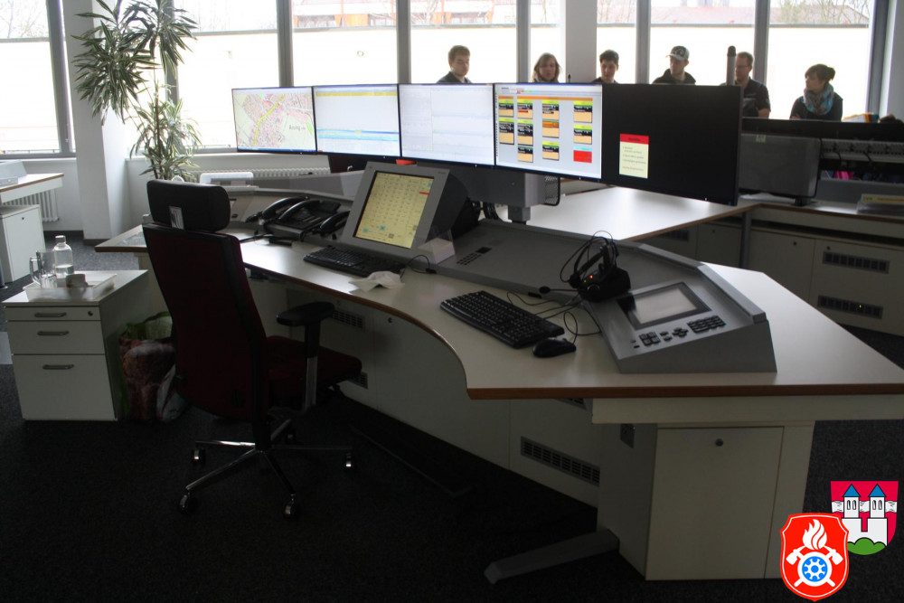 Im Obergeschoss wurde uns eine Präsentation über die Leitstelle Rosenheim, deren Aufgaben und die Einstiegsmöglichkeiten gezeigt. Im Raum nebenan war dann das Herzstück der Leitstelle. Der Raum, in dem sich die tagsüber bis zu sechs und nachts bis zu vier Disponenten in Zwölf-Stunden-Schichten rund um die Uhr befinden. Der Raum, in dem jeder Anrufer, der die 112 im Rosenheimer Landkreis wählt, rauskommt. Wir waren live dabei, wie die Disponenten Anrufe annahmen, mit den Feuerwehren funkten, Rettungsdieste alarmierten und um Punkt 12 Uhr den monatlichen Probealarm auslösten. Unsere Fragen wurden uns freundlich beantwortet.